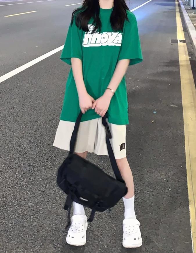 綠色是真的太顯白了,在春夏季節,穿這個顏色的衣服真不錯,至少能把你的膚色襯托得很白皙,也讓你看起來充滿活力氣息。大大版型的綠色t恤,搭配休閒短褲和洞洞鞋,簡簡單單又不挑人。