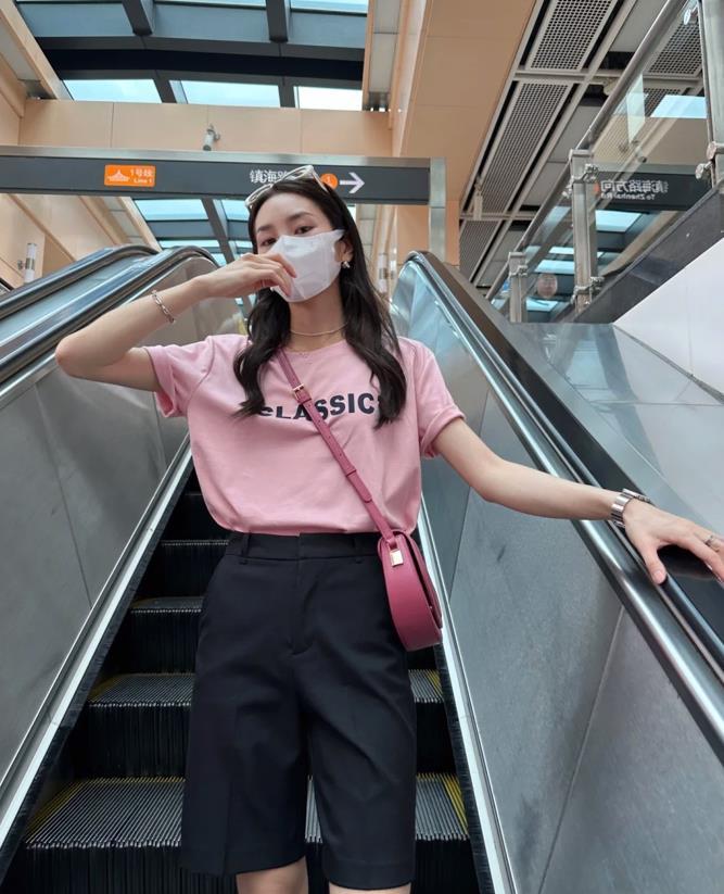 不管是哪個女性,在她的心中,都有着一顆少女心,這無關年齡,粉色系的t恤配黑色西裝短褲,清爽又不失少年感的搭配。