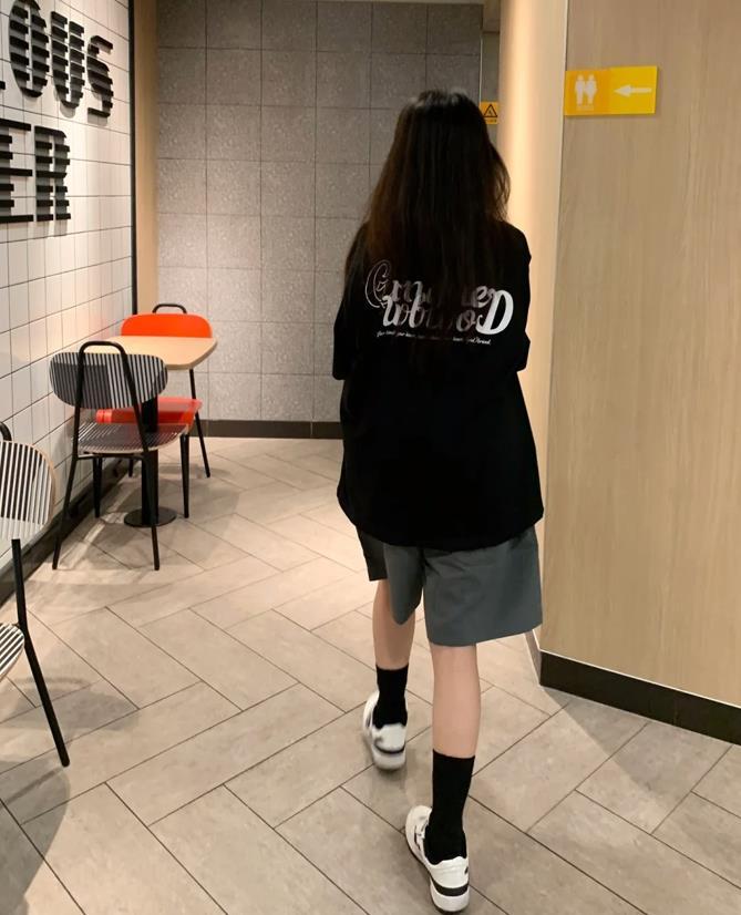 喜歡這種無性別風的穿搭,上下都是寬鬆的版型,對身材一點約束感都沒有,黑色短袖T恤+休閒短褲,微胖大腿粗的身材就可以這麼穿,顯瘦舒適又帶點慵懶的味道。