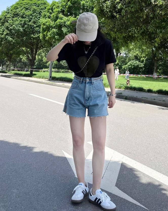 牛仔短褲配t恤,那可是夏天最耐看時髦的組合,既適合日常休閒,又可以進行戶外運動,t恤的款式和顏色都比較多樣化,有純色的、印花的,條紋的,可以滿足不同人羣的穿搭需求。