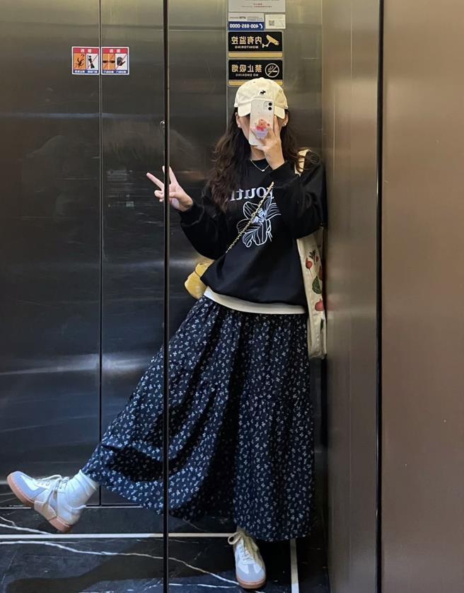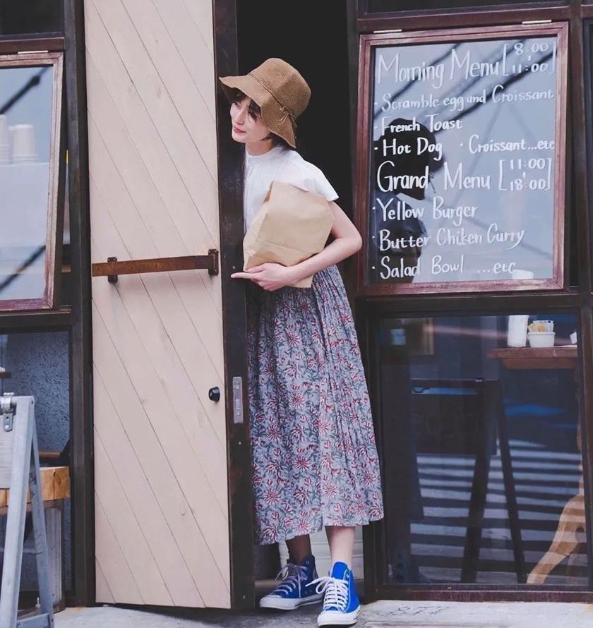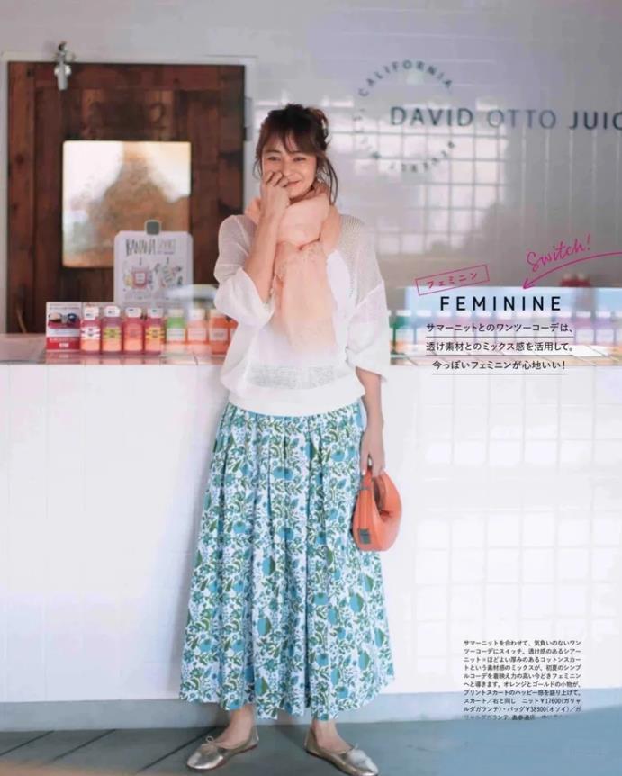“花裙子”的流行款式中,半身碎花裙也是深受衆多女性們喜歡的,裙子的長度選擇過腳踝的位置,能巧妙遮掩起腿部的所有缺點。上衣建議選簡約純色的基礎款來配,遵循一簡一繁,更能打造出造型層次。