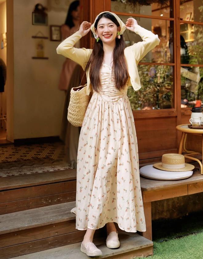 春夏季節都是一個很浪漫的季節,想要在這個季節裏拍出美美的照片,沒有一條美美的裙子怎行?亮色的碎花裙是必不可少的,搭配薄款小針織開衫,一股法式風情的氣息撲面而來。