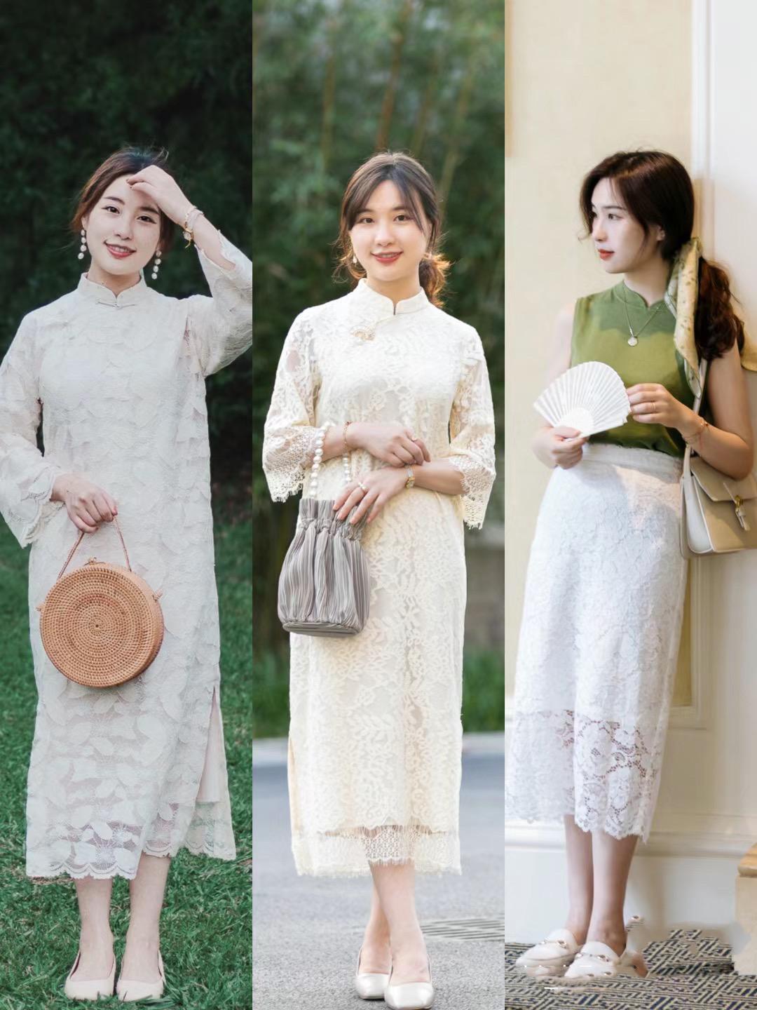 稍微寬鬆的蕾絲連衣裙,增加了束領、斜襟、盤扣的設計,在婉約中多了幾分精緻美。稍微寬鬆的版型,對身材的包容性更強,微胖一點的小個子也可以駕馭。