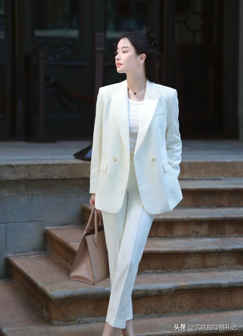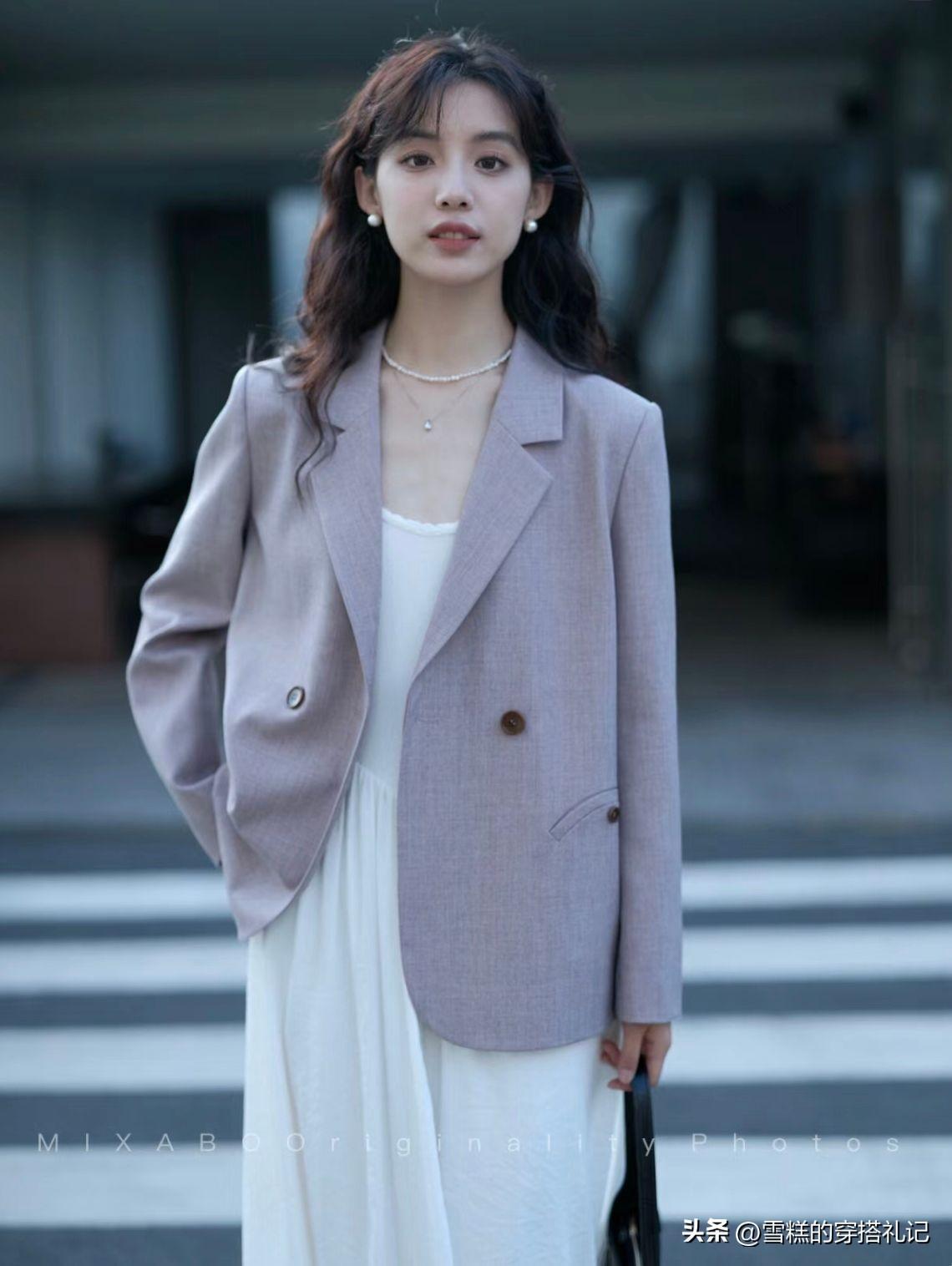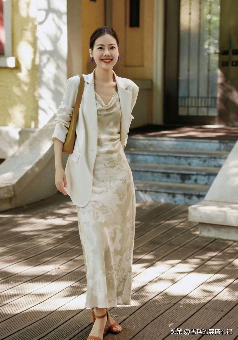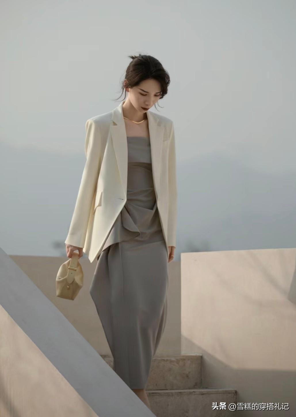 簡約的西裝外套如果要搭配一些優雅型的裙裝,那麼建議大家優先於入手的當然就是同爲淺色系的搭配,在選擇裙裝的時候最好是能夠將醋酸裙或者是絲絨以及垂感較重的一些簡約型的裙裝與其進行結合,不管是從肉眼可見的質感以及氣質的襯托都是非常上乘的。