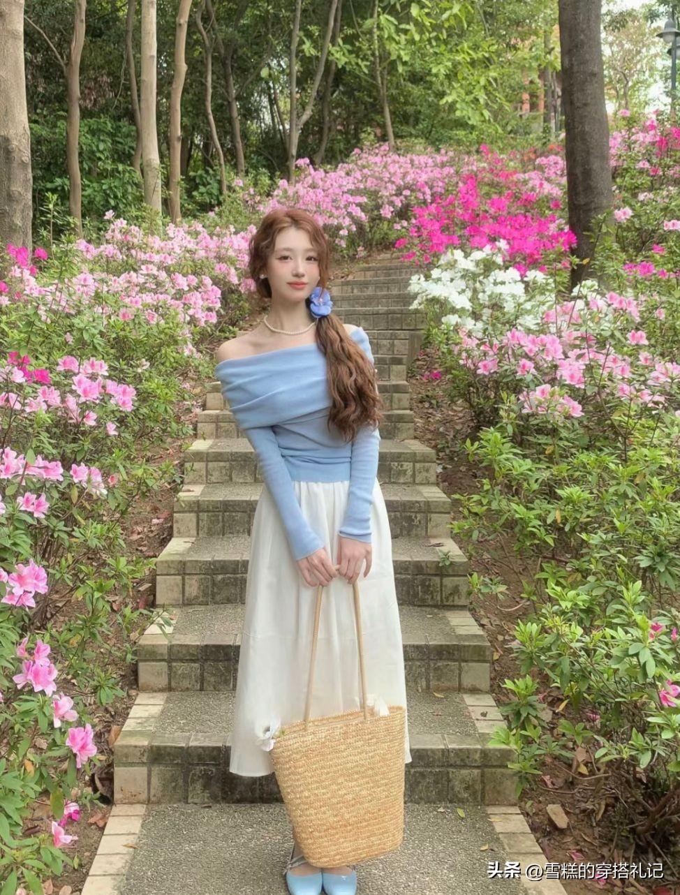 一字肩的單品在春夏這兩個季節的時候還是更推薦大家優先選擇短款的設計,或者是已運用上下兩個單品完全是屬於分割開來的色系組合,上短下長的標準比例一定要展現出來,除了出現絕對的魅力的同時,我們的身形優勢也是一定要注重營造的喲。