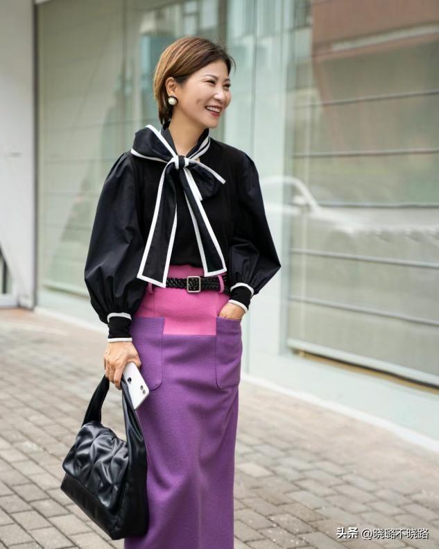 我們以一套最簡約的黑白配色來作爲介紹,就算是最基礎款的襯衫搭配半裙,我們也可以通過色彩的深淺遞進,呈現出視覺上的恰好優化感,而且也更加契合中年女性對於優雅高級感穿搭的需求。