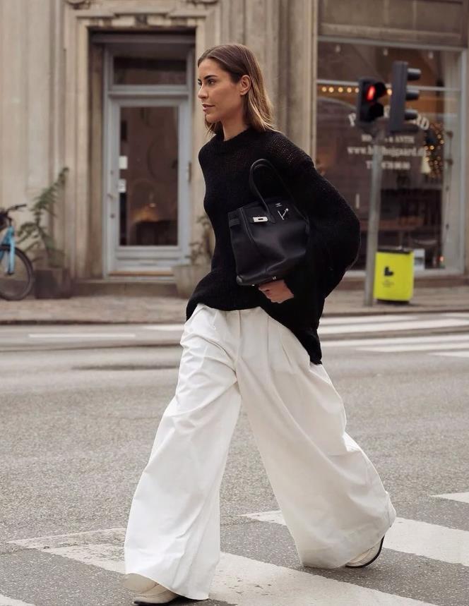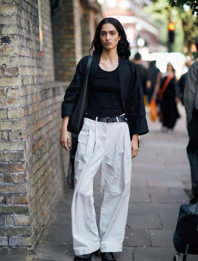 黑白配的穿搭,是永不過時的,不懂配色組合的人,選擇這種顏色搭配就對了,上下寬鬆的搭配,自帶一種鬆弛感,寬鬆的褲子,對於腿型具有很好的包容性,顯瘦藏肉又舒適。