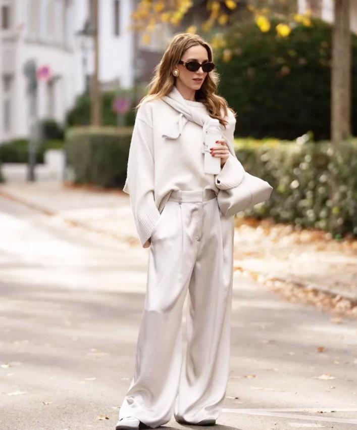 這是屬於職場的穿搭,也屬於日常,鬆弛、隨性又自在,灰+黑的配色組合,真的最時髦經典和高級了。上寬下松的搭配,十分顯慵懶,一雙運動鞋的加入,又多了幾分休閒氣息。