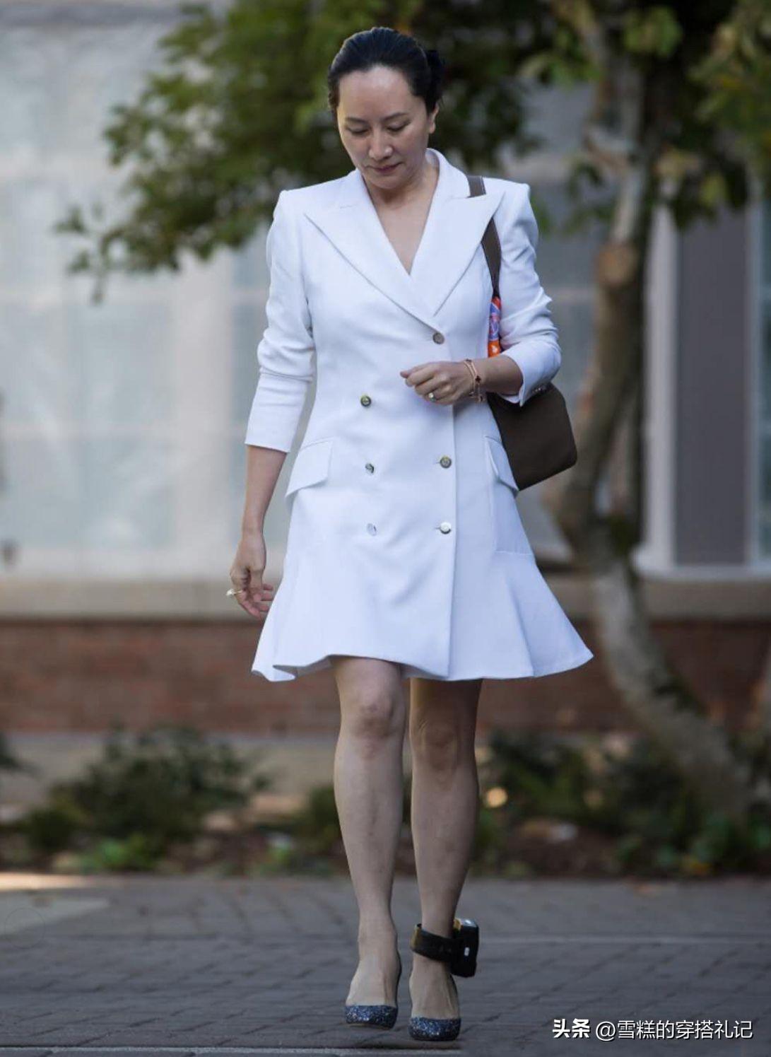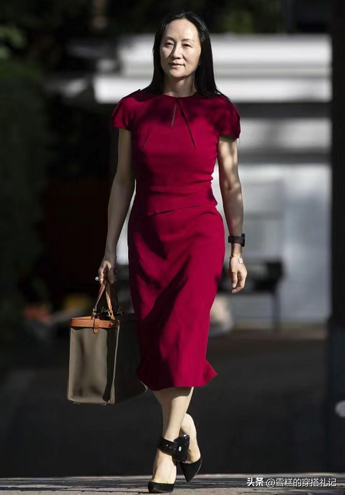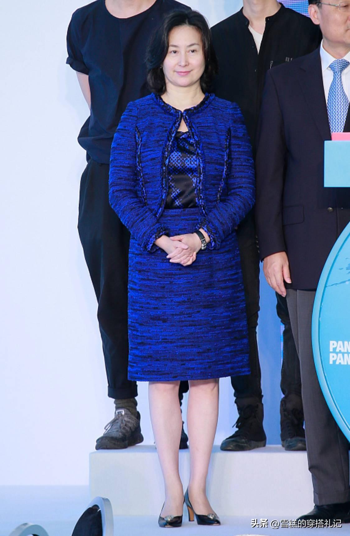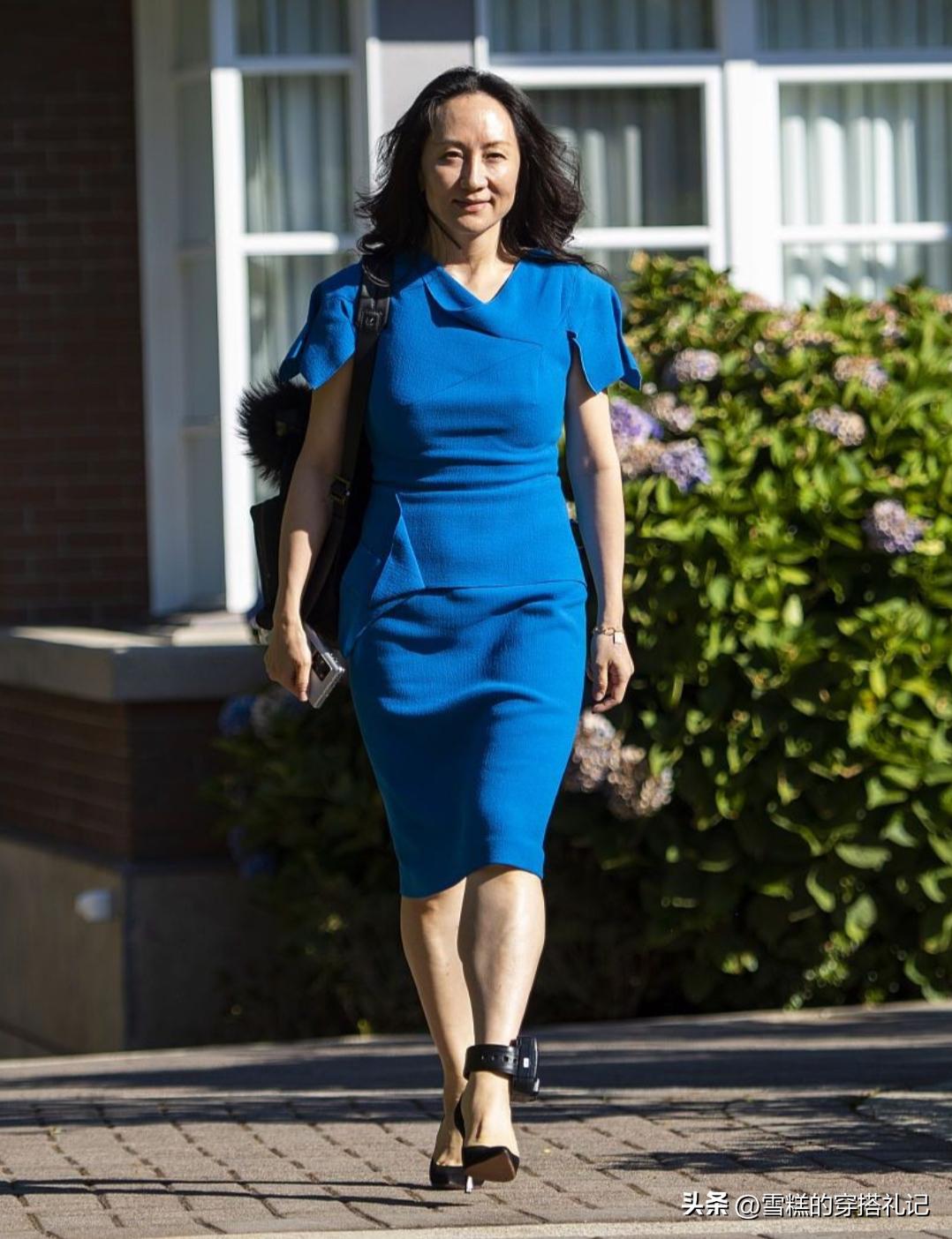 只要服裝的顏色選對了,就能有效的修飾膚色,改善肌膚暗沉發黃的問題。比如孟晚舟這一套寶石藍的套裝裙,就特別襯她的氣色,顯得高貴感十足。