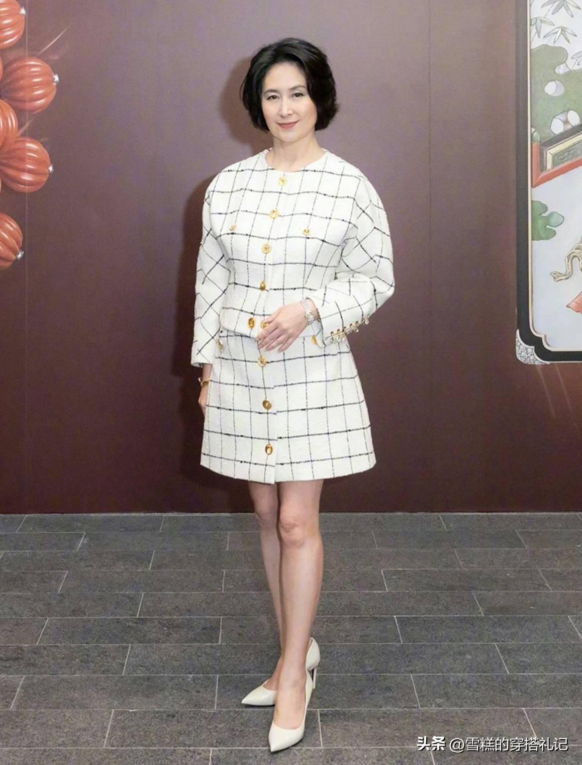 像何超瓊這一套簡約款的格子套裝裙,腰身採用修身設計,裙裝剪裁利落流暢,搭配一雙同色的尖頭高跟鞋,高雅又時尚。