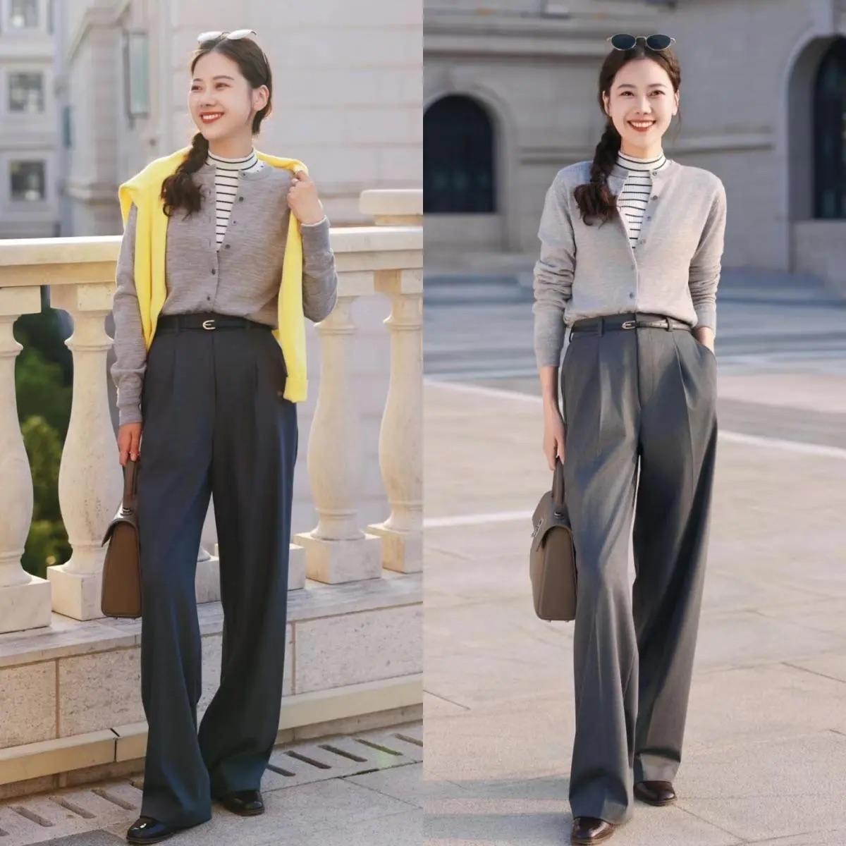 灰色系的針織開衫,可以直接單穿、也可以疊搭條紋打底衫。配深灰色的西裝闊腿褲,簡單利落又更多了包容性。像這種寬鬆的西裝闊腿褲,對於腿粗、胯寬的女性也很友好。