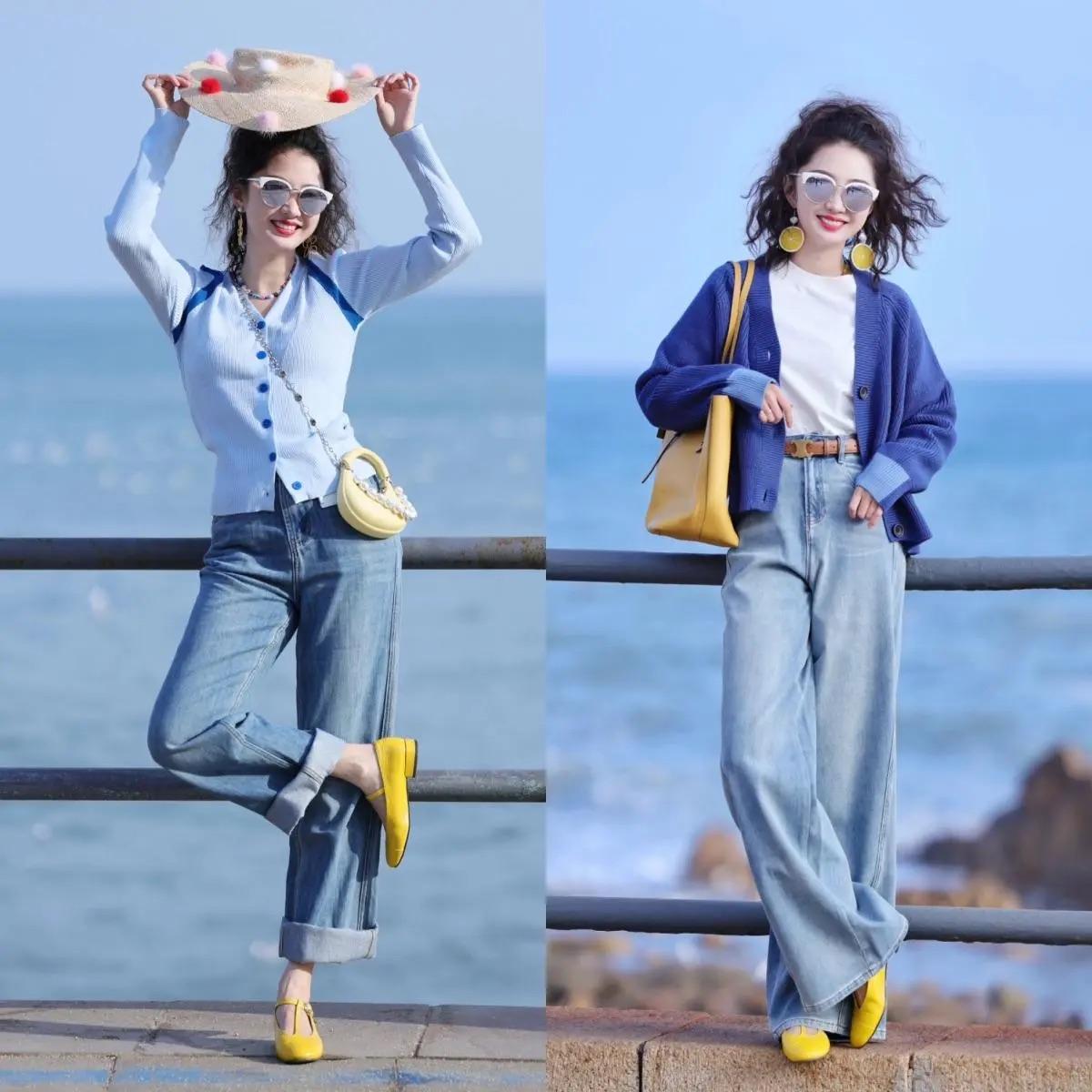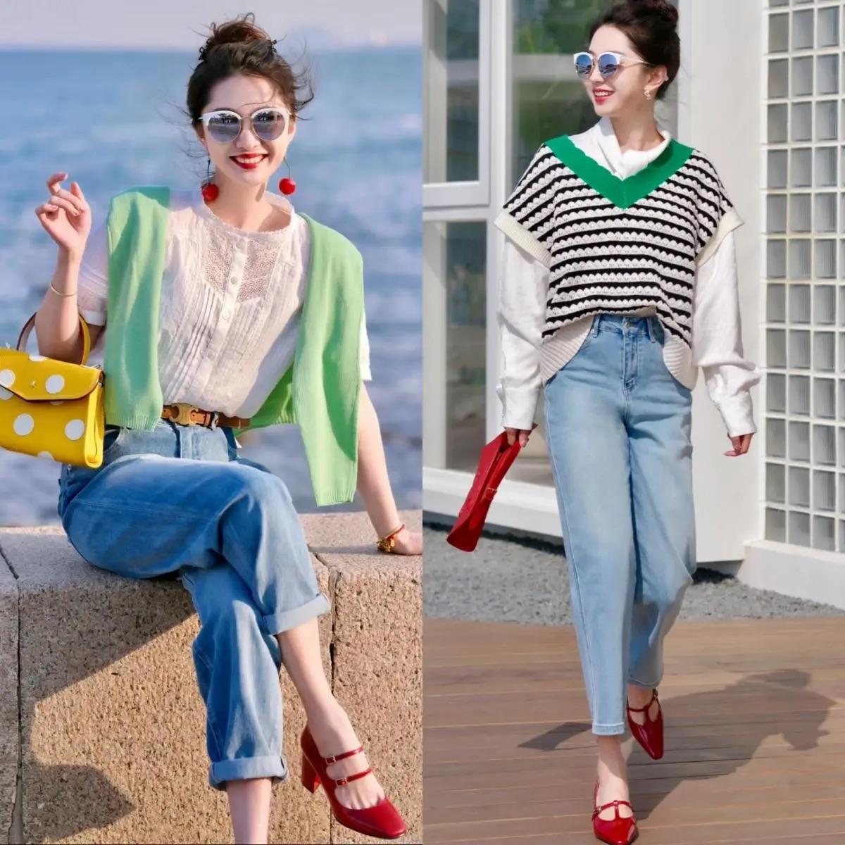 藍色系的牛仔褲,也是隨手拿過來就可以凹造型的單品。藍色牛仔褲配白襯衫、針織馬甲、紅色瑪麗珍單鞋,復古洋氣、氛圍感十足,頗有摩登女郎的範。