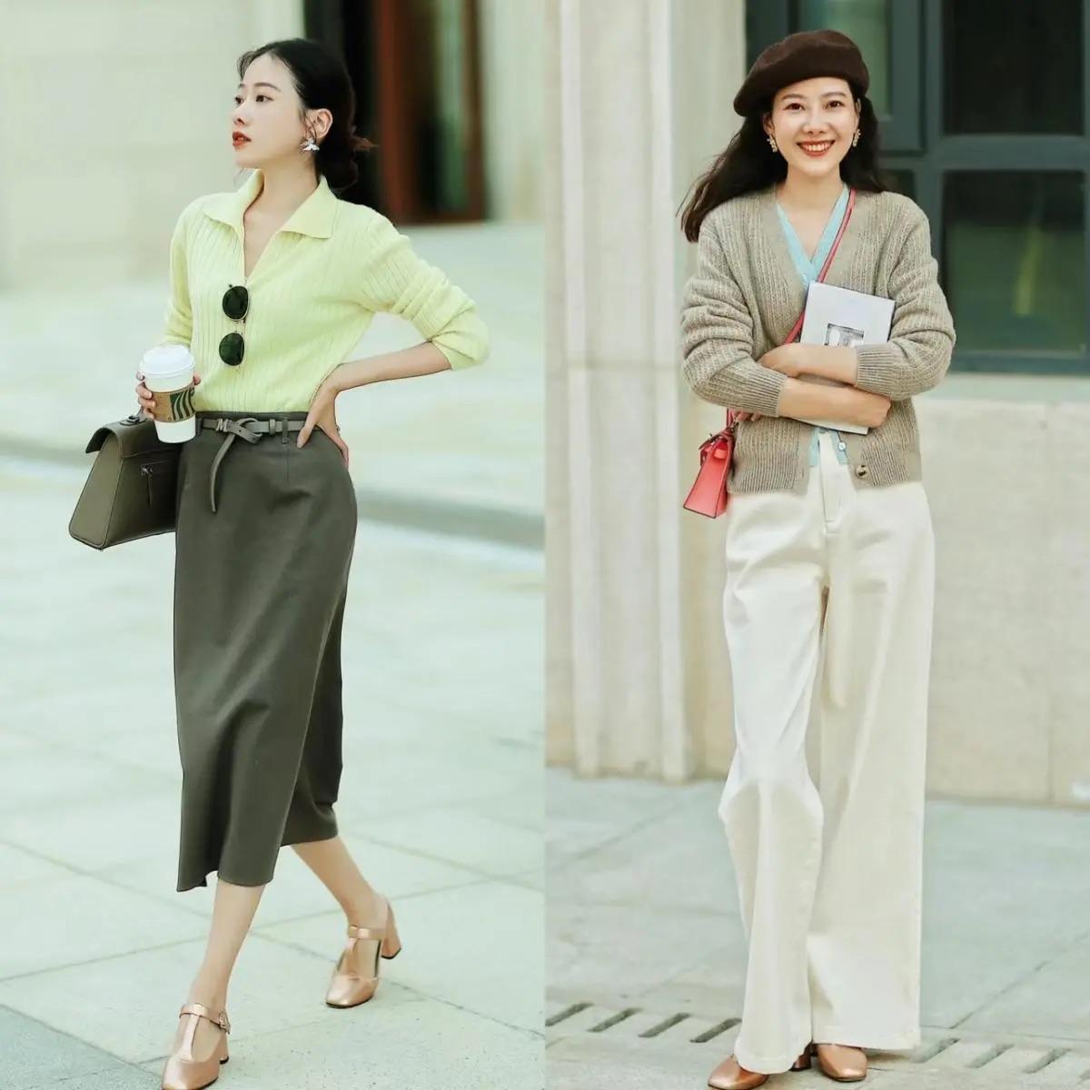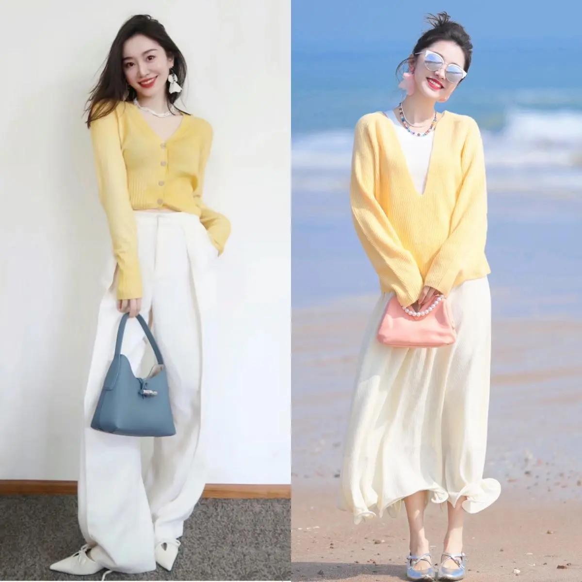 色彩的乾淨柔和,冷暖的融合給人一種嫺靜自然的美。鵝黃色的針織衫,可以配清新的白色系。不管是白色西裝褲、還是半身裙都格外溫柔。
