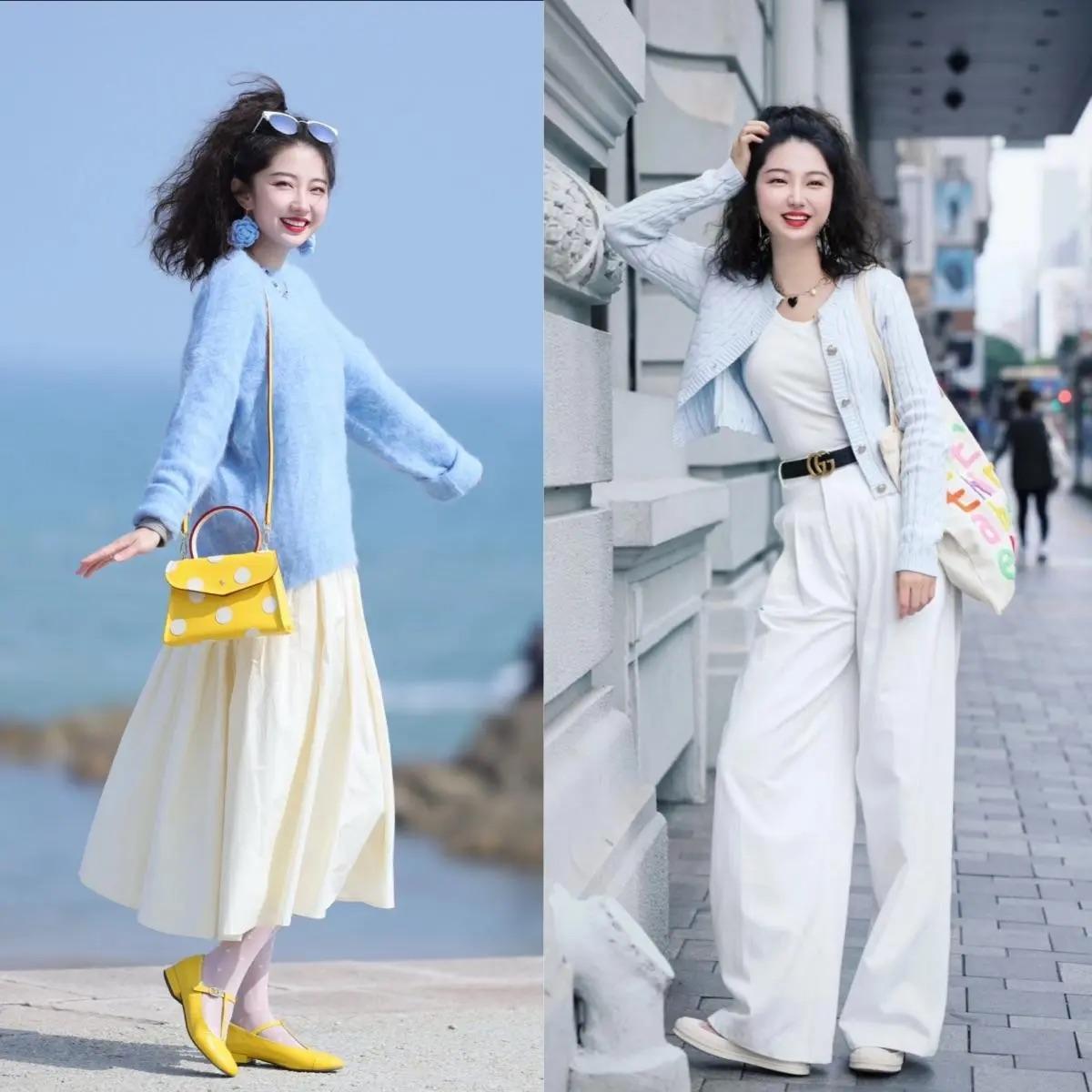 比如淺藍色的針織衫,我們可以配修身的白色吊帶、搭一條高腰的白色直筒褲,整體風格舒適且溫柔。白色直筒褲配寬鬆一點的褲筒,擁有更強的包容性。