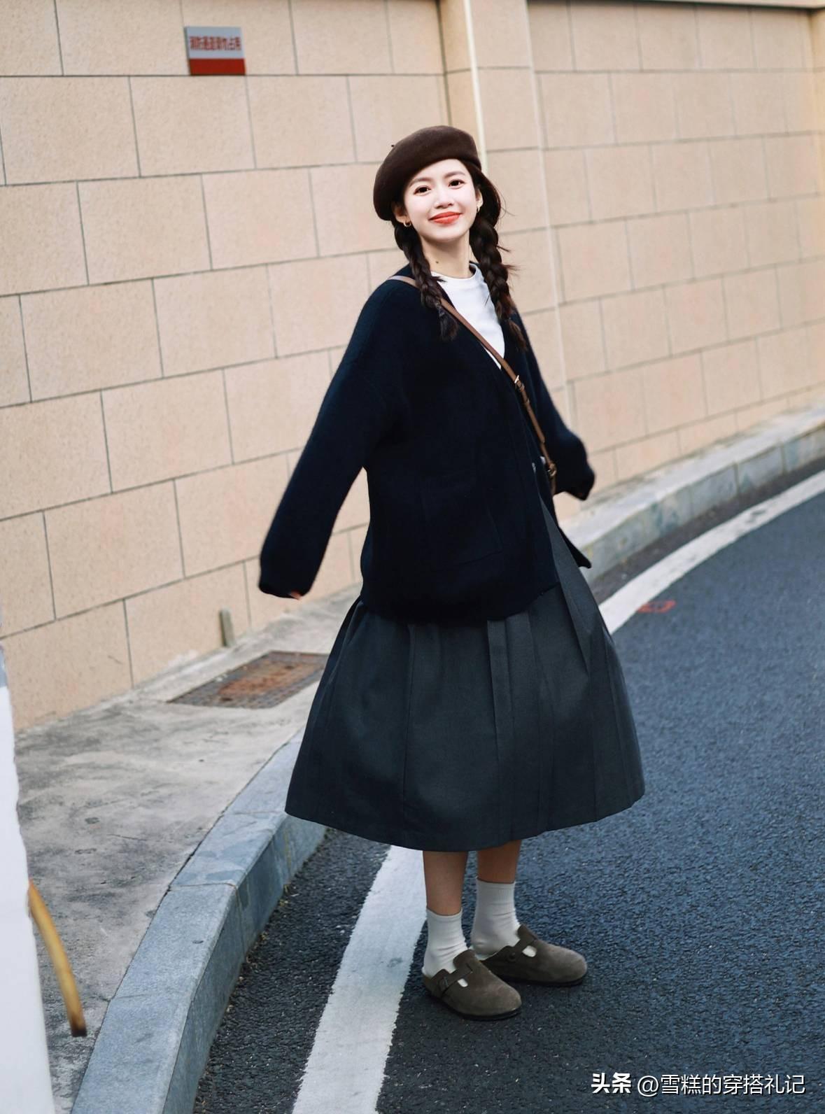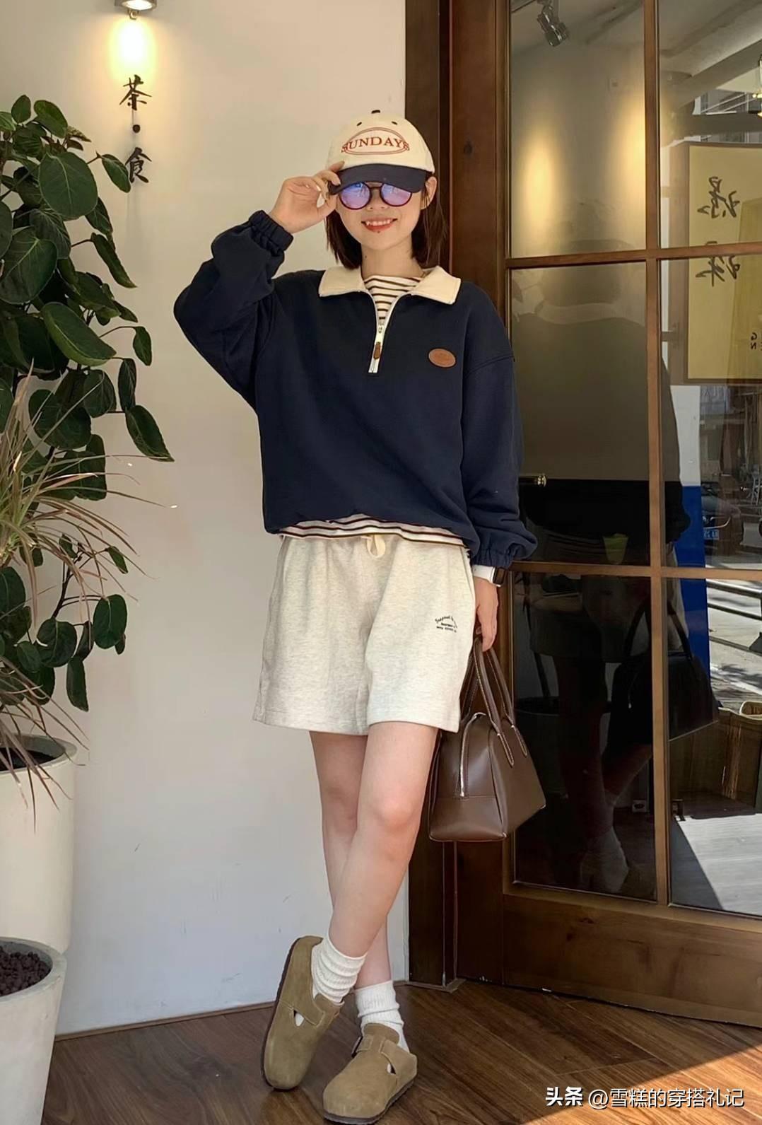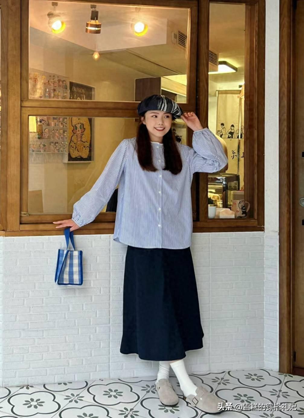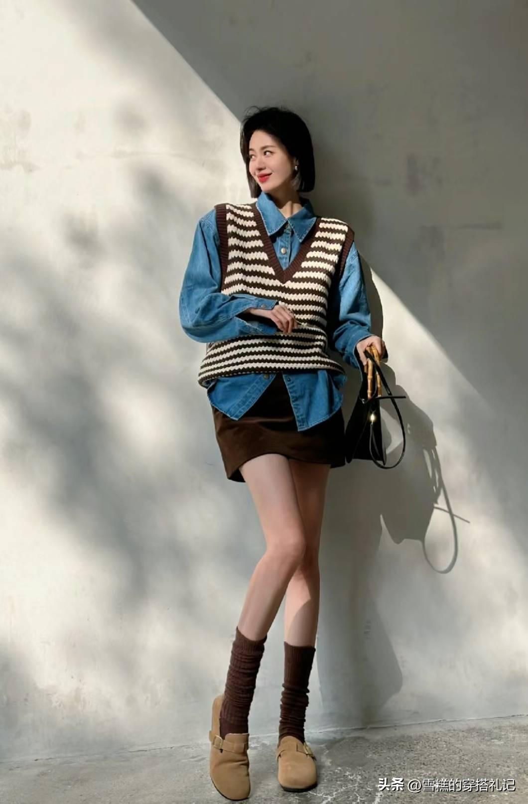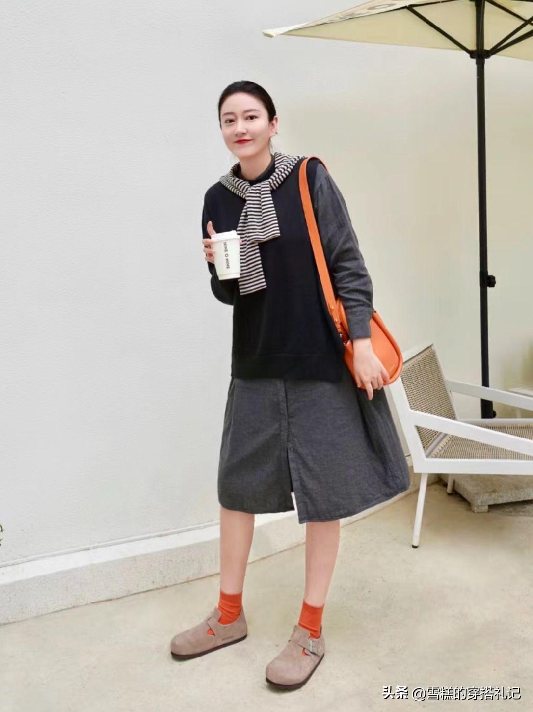 再搭配條紋馬甲和襯衫的時候,建議大家可以選擇一條高筒堆堆襪,搭配同色系的勃肯鞋,在視覺上可以很好的延伸腿部線條。