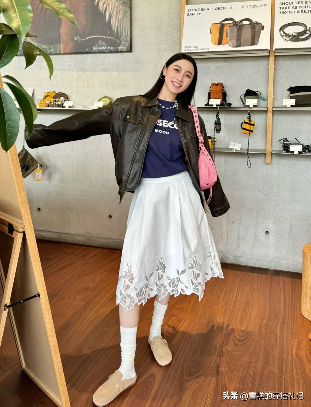 ★案例:黑色皮衣+白色半裙+杏色勃肯鞋