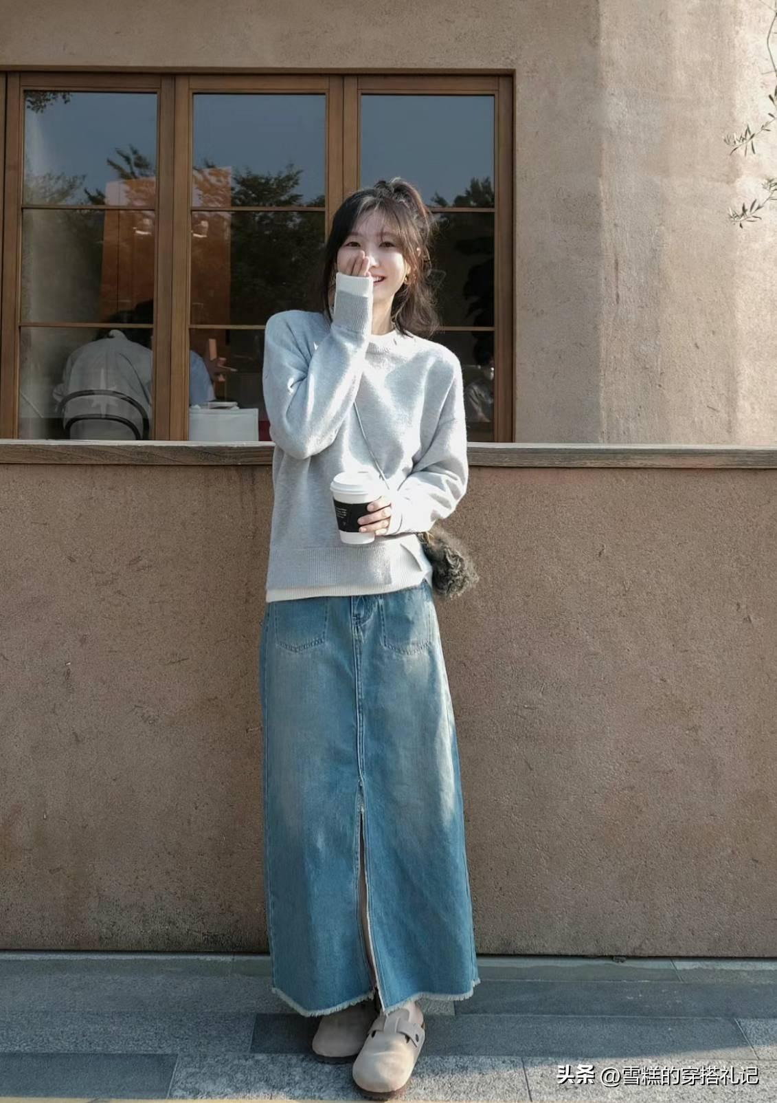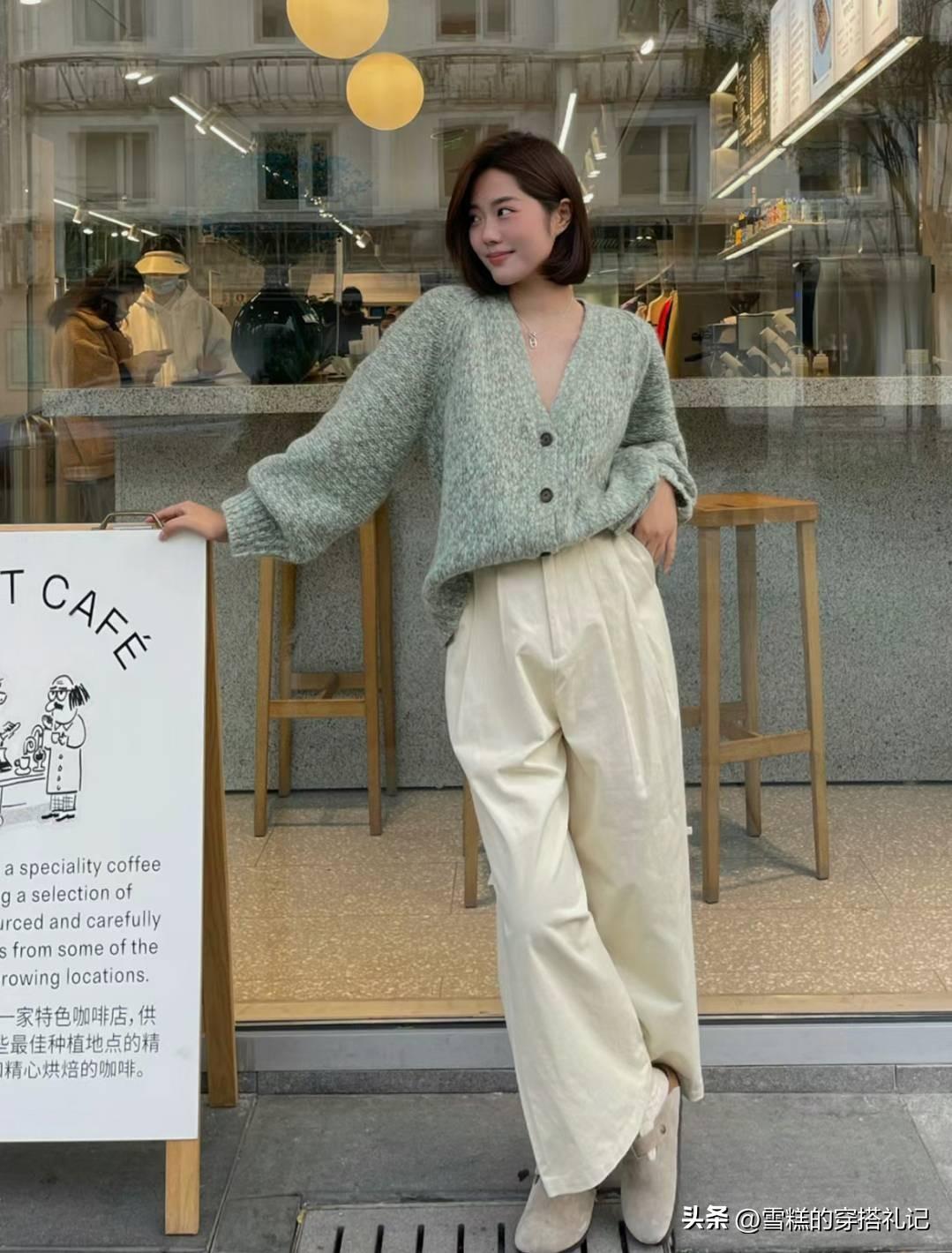 闊腿款式的牛奶褲,具備一定的膨脹感,和淺灰色勃肯鞋適配度極高。當下半身的單品都很簡約的時候,上衣就要通過彩色打造亮點,比如豆綠色的針織開衫,通過V領打造留白效果更吸睛。
