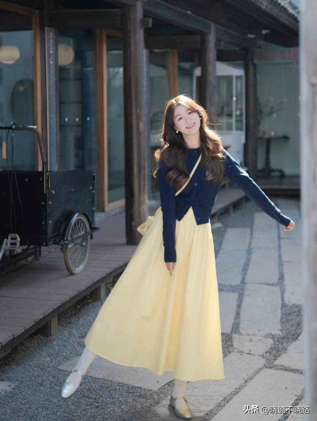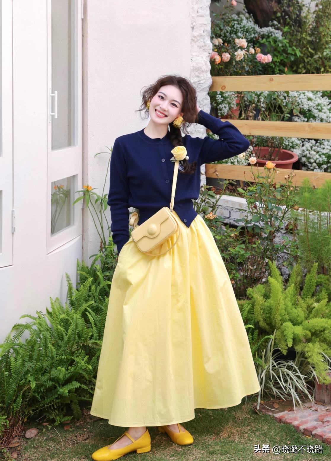 攻略①檸檬黃A字裙+藏藍色針織衫