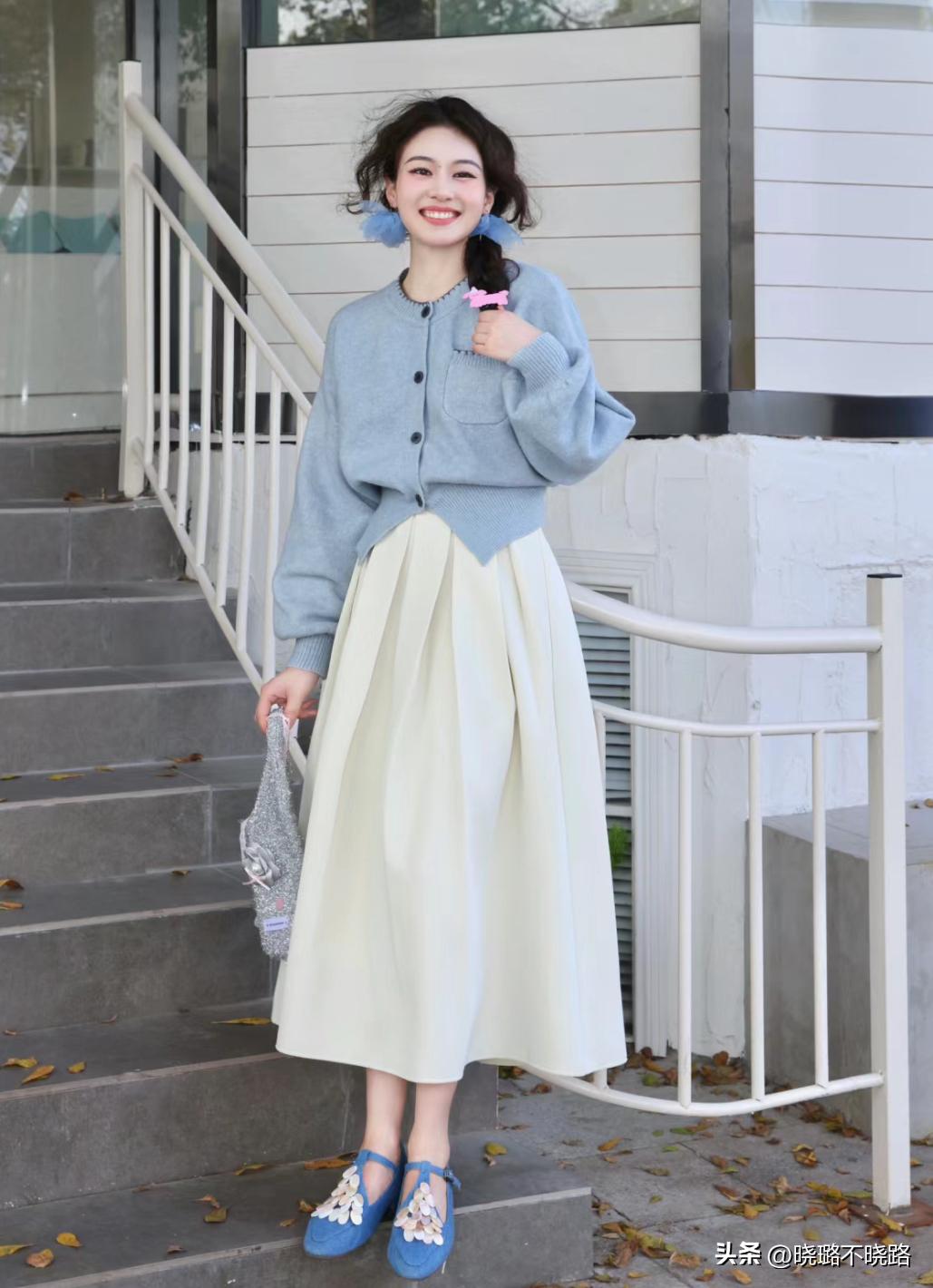 •上短下長:穿衣打扮的初始條件就是揚長避短,特別是對於小個子來說,搭配A字半身裙,最關鍵的就是分割黃金比例。像這種短款針織衫和高腰半裙的組合,就能滿足你的需求。