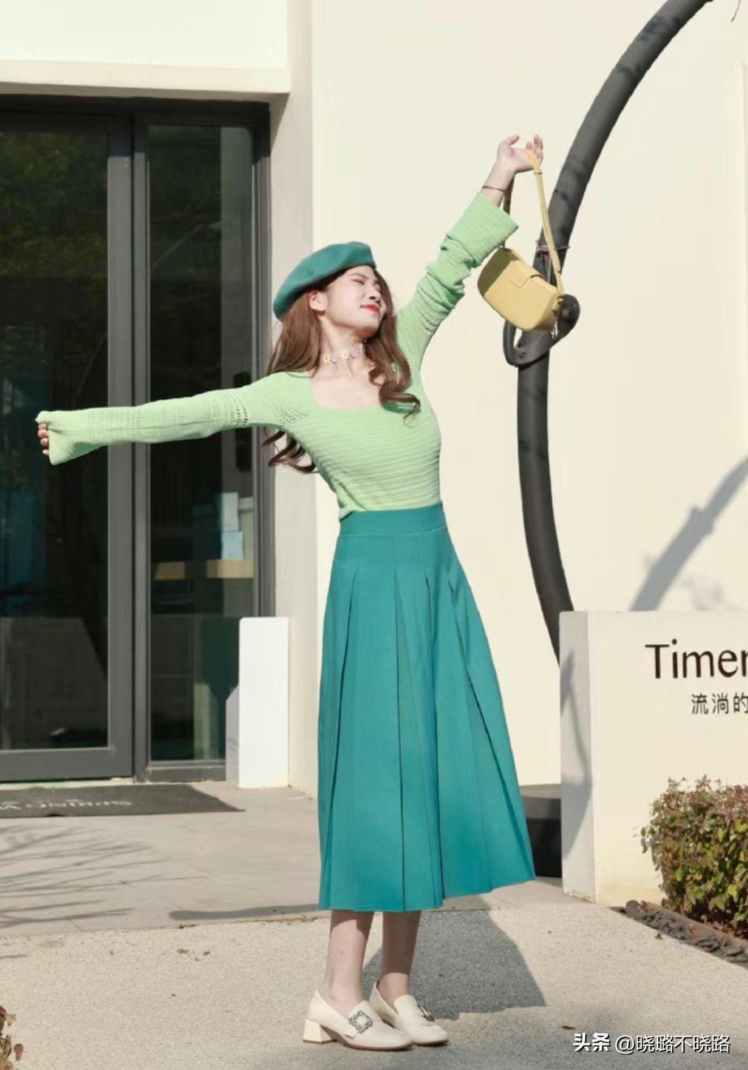 •同色系搭配:方領針織衫和百褶裙採用同色系的搭配,看上去會更加協調,通過不同的色調,又能有效的劃分層次,擺脫單調乏味的氣息。綠色系的搭配,就很符合春日氛圍感,清新淡雅回頭率100%。
