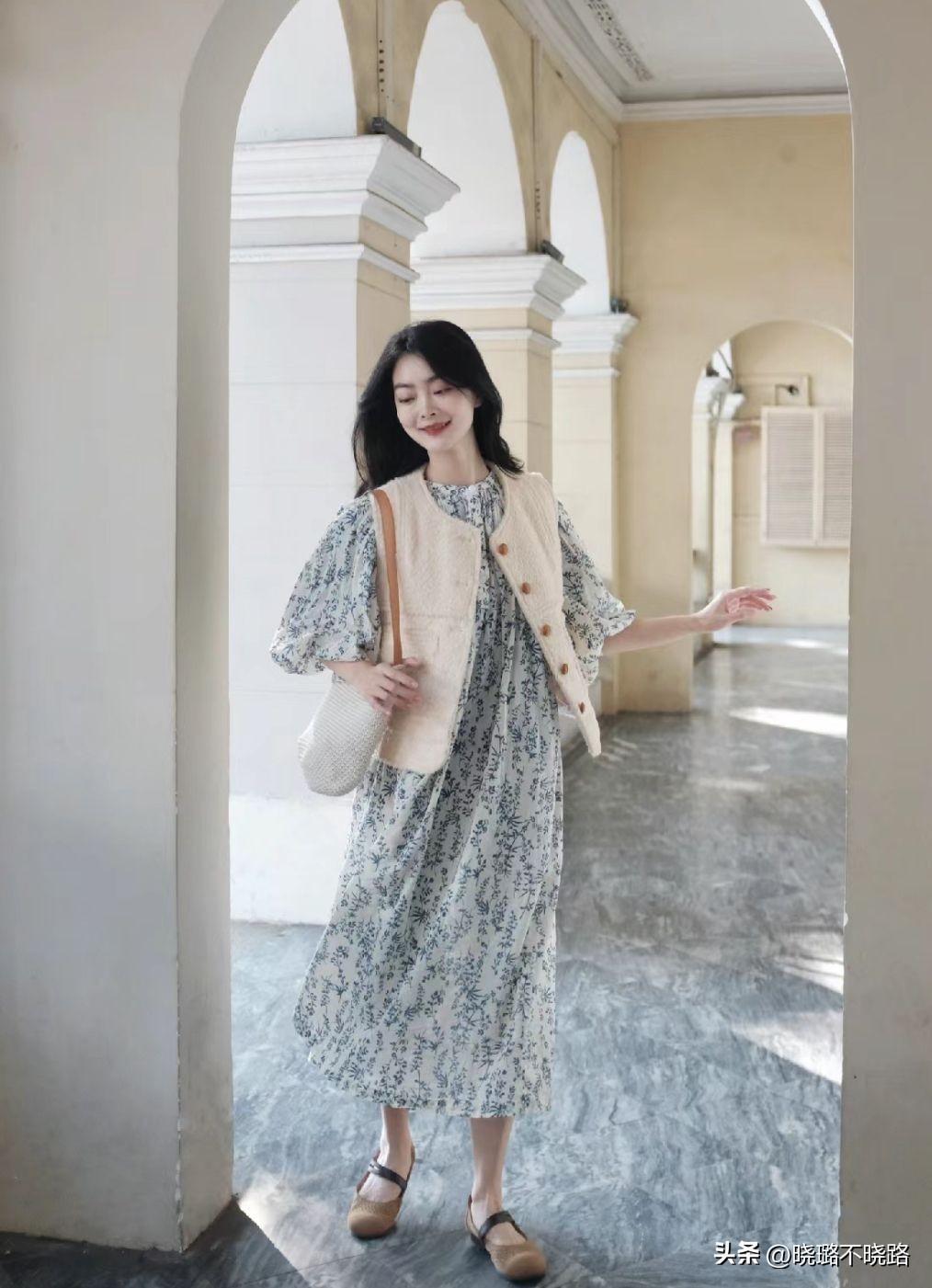 •繁簡結合:沒有技巧的穿搭是不完美的,在搭配碎花裙的時候,我們可以選擇基礎色的單品進行疊加。比如米色馬甲,就可以更好的襯托碎花裙的優勢。