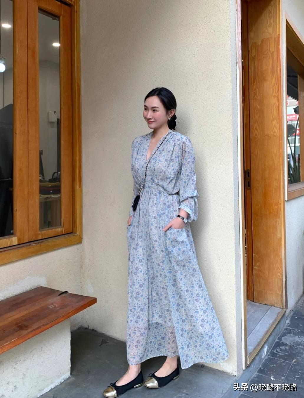 •適當露膚:碎花裙想要穿的好看,還要適當的露出肌膚線條,通過V領、和透膚感的面料,去增添留白感,再搭配一雙淺口設計的芭蕾鞋,溫柔又時髦。