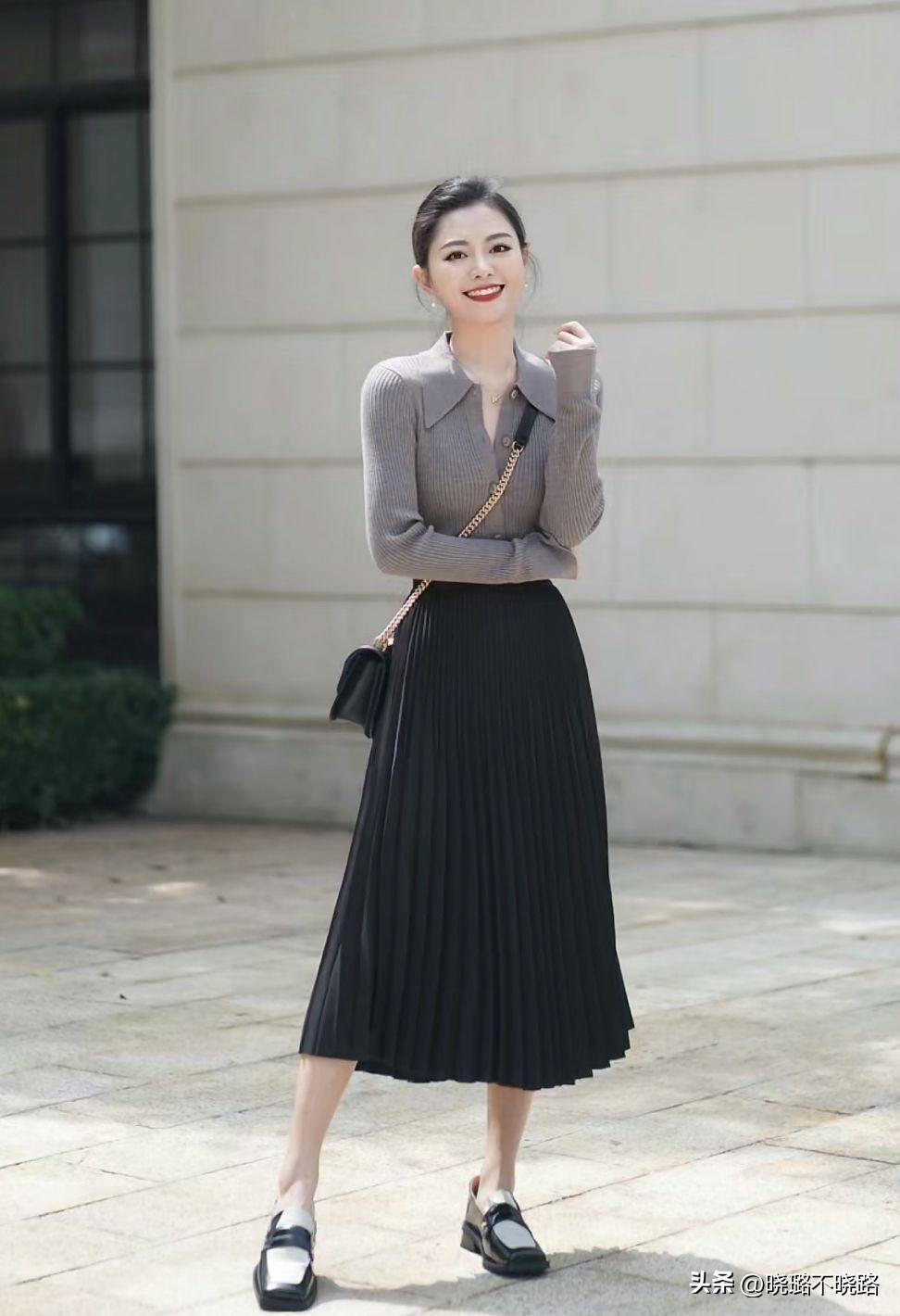 •化繁爲簡:百褶裙本身就是屬於有設計感的單品,若搭配的上衣過於繁瑣,給人的感覺就會很俗氣。相比之下,簡約款的polo領針織衫,更有利於襯托百褶裙的優勢。