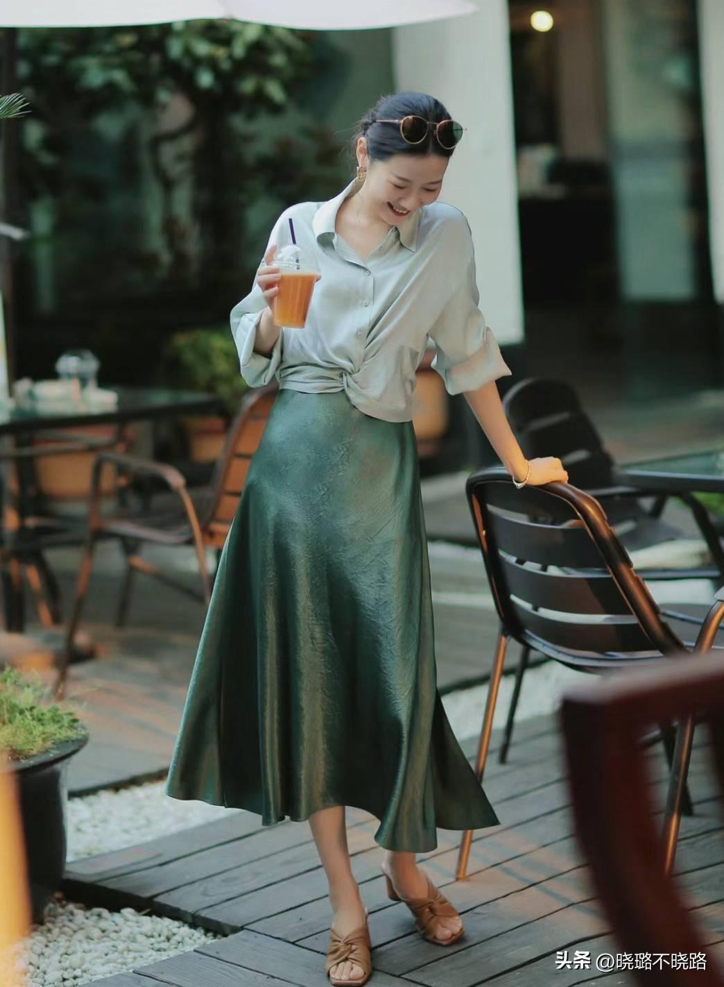 ✓墨綠色絲綢裙,配米白色針織衫太溫柔