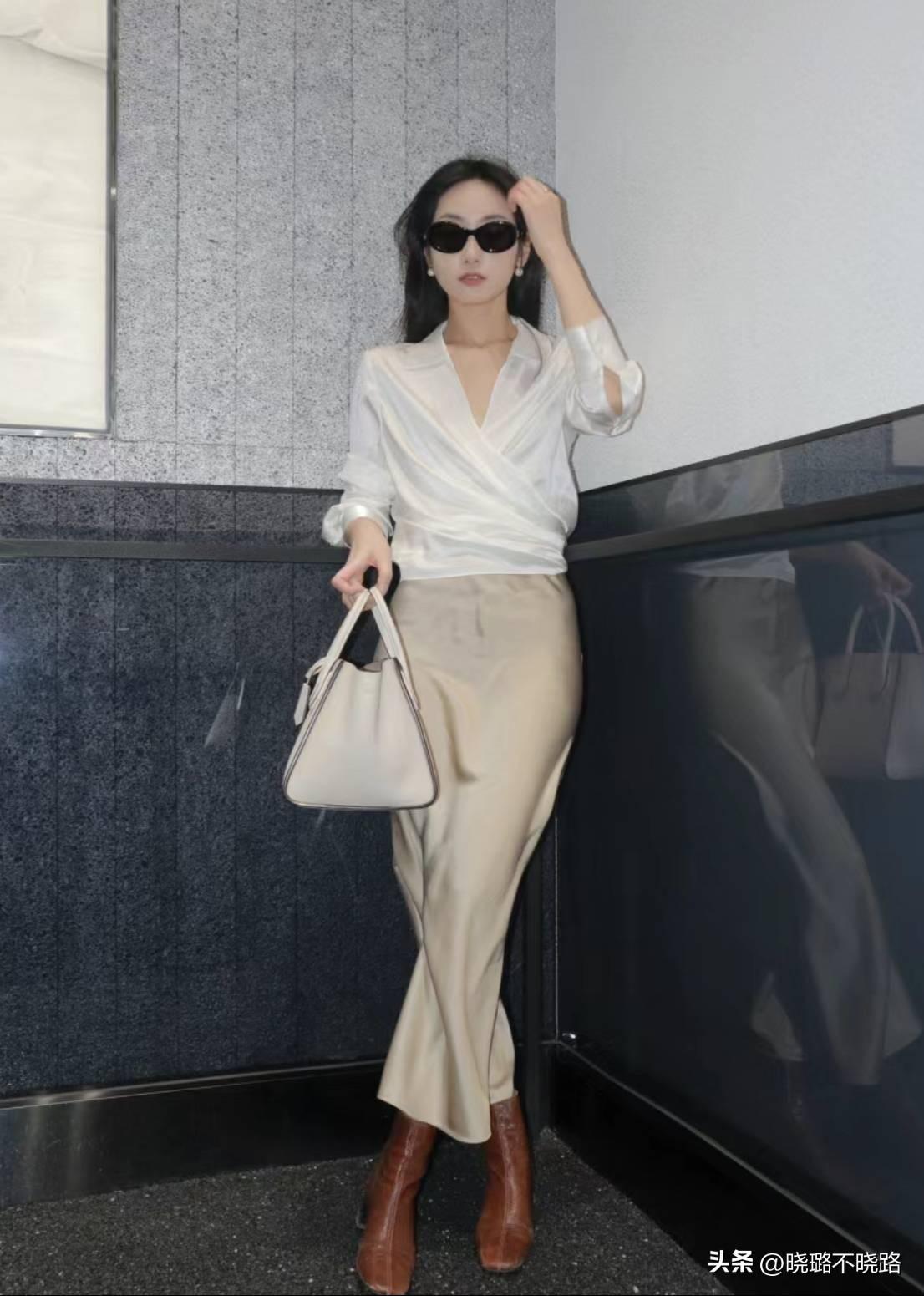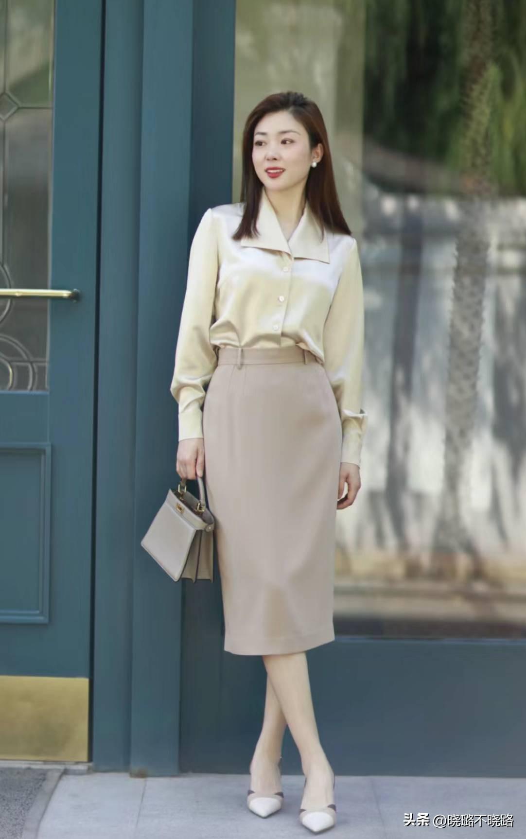 相比之下,將香檳色用於材質柔軟、順滑、親膚細膩的絲綢面料上,不僅上身效果舒適,還能提升整個人的品位。像這一款香檳色的絲綢襯衫,搭配上同色系的高腰鉛筆裙,就顯得特別知性,還不失女人味。