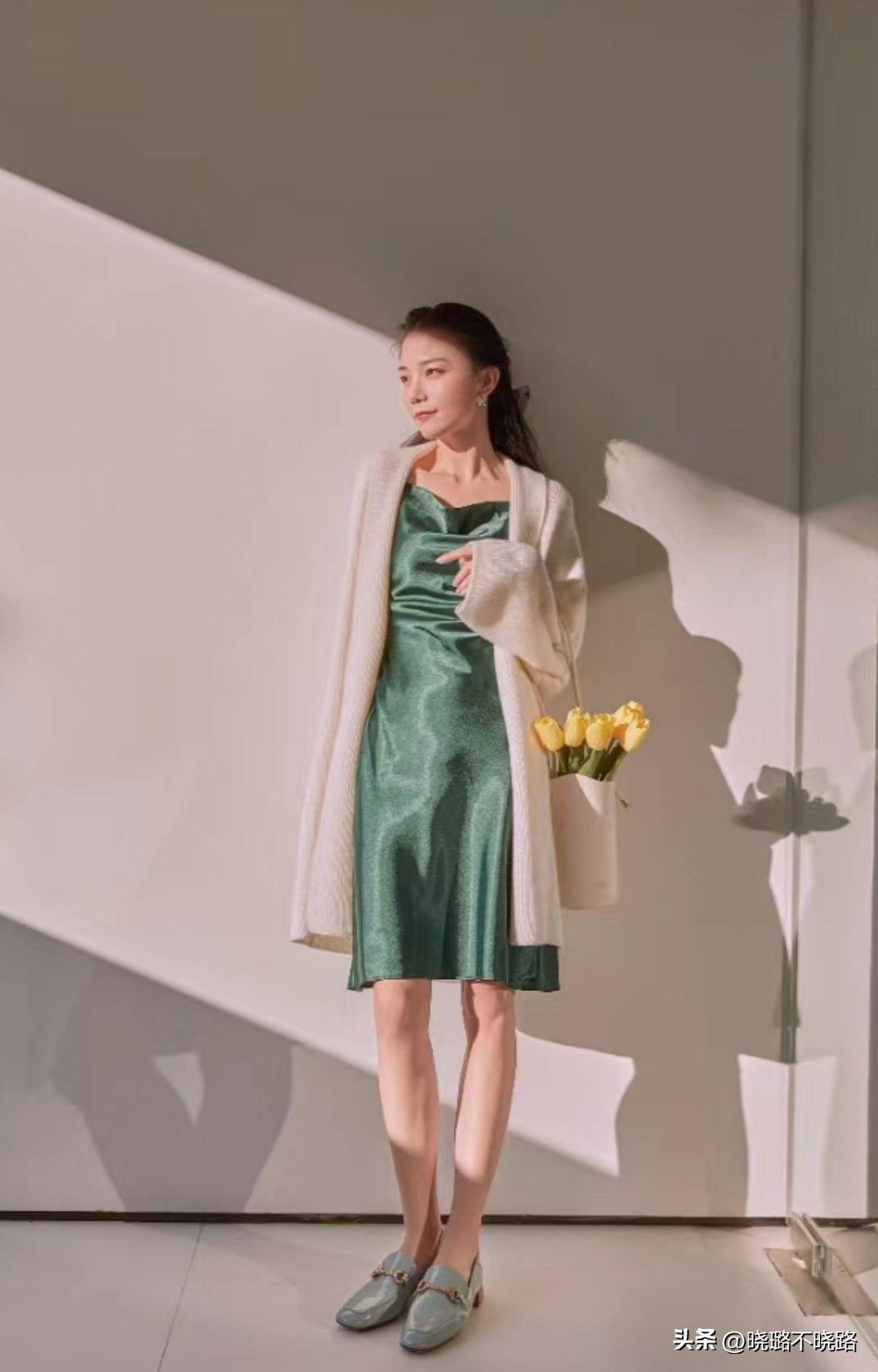 可一旦將墨綠色覆蓋於絲綢吊帶裙當中,再疊穿一件米白色的針織開衫,便可以輕鬆的營造出氛圍感,打造出高雅又溫柔的氣質。