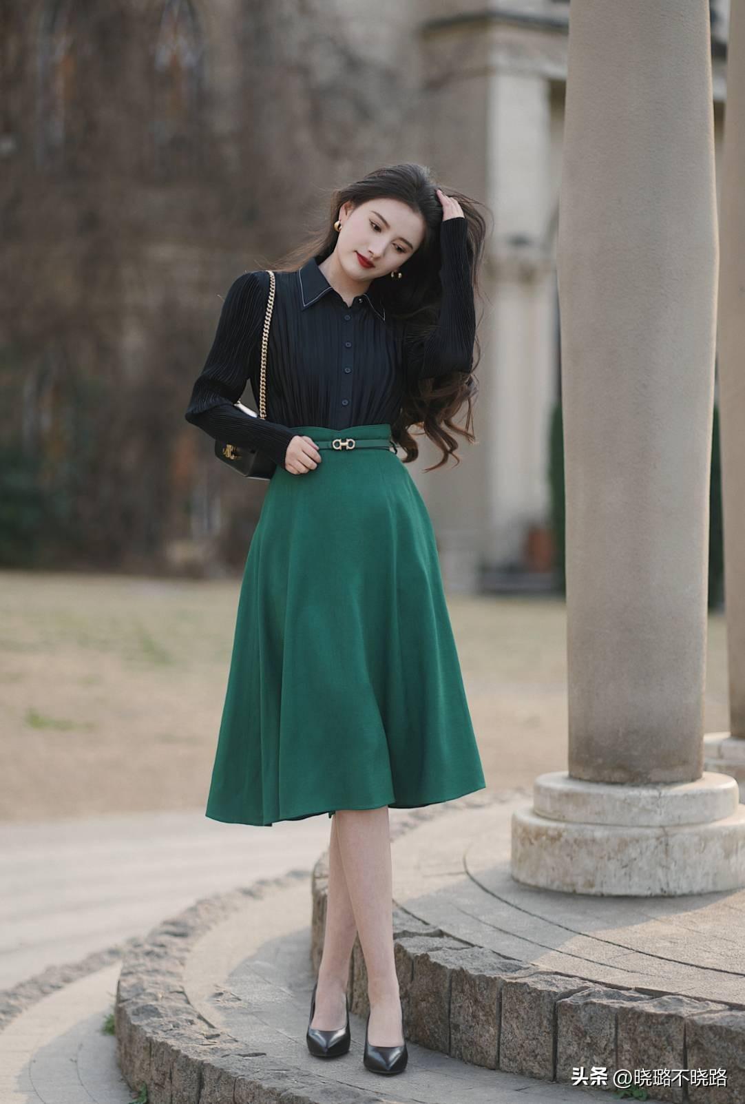 對微胖身材的女生來說,像這款墨綠色的半身傘裙也是不二之選,高腰款式+闊擺設計,輕鬆穿出顯高遮肉的效果。