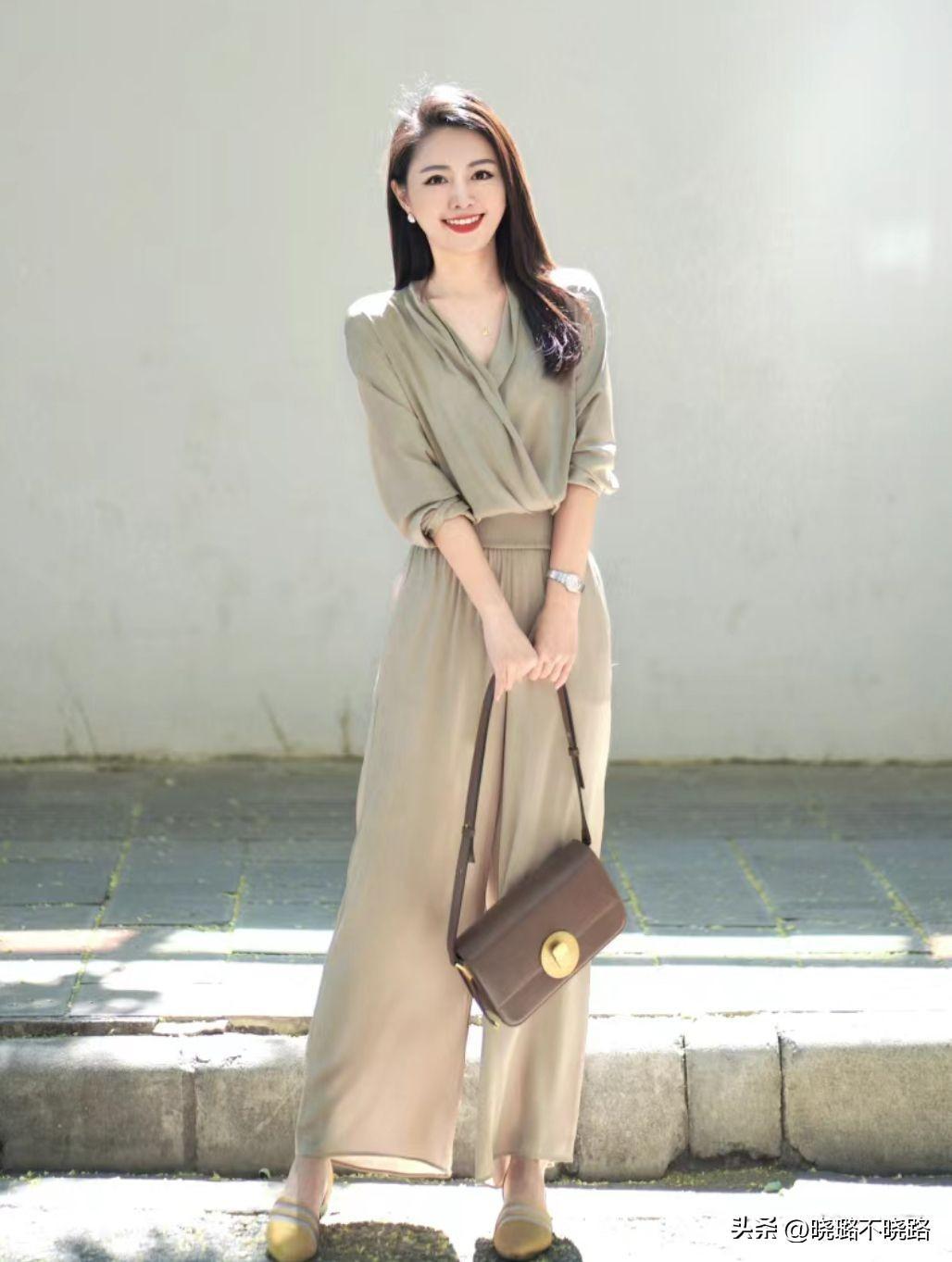 香檳色的真絲套裝,版型一定要寬鬆一點,這樣才能夠最大化的營造出慵懶狀態。V領款式的真絲長袖+真絲高腰闊腿褲,搭配出來的效果就非常高級。