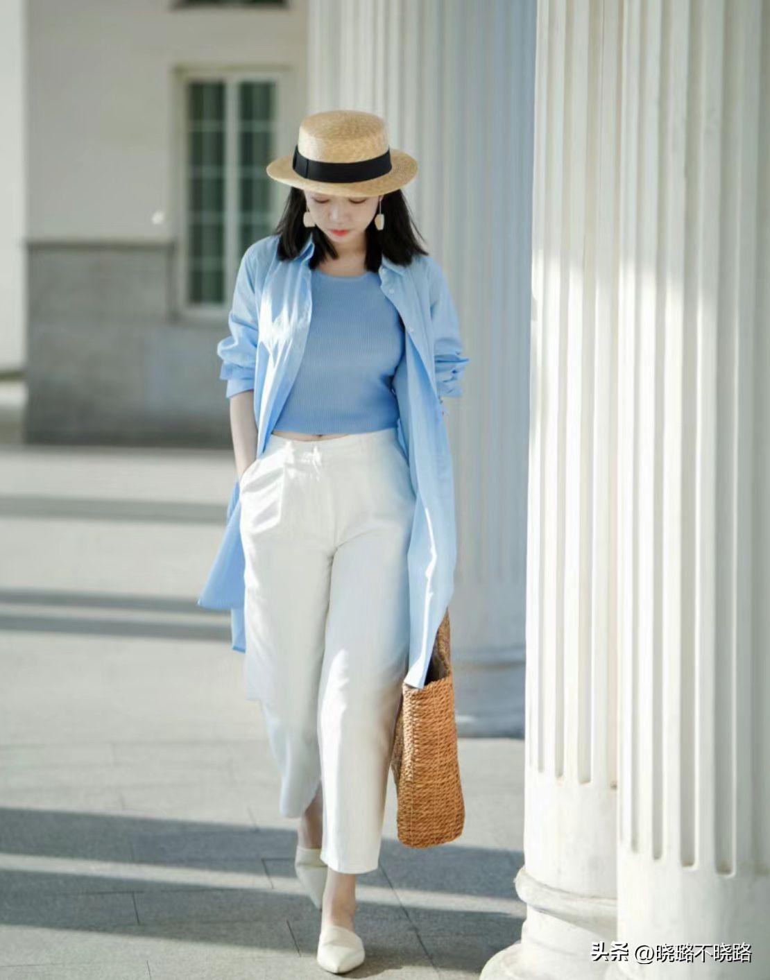 上衣採用同色系的前提下,下裝就應當用基礎色進行過渡,比如白色九分卡布裏褲和白色尖頭鞋,搭配出來的效果就很清爽;再通過卡其色草帽和草編包進行點綴,又能保持恰到好處的精緻感。