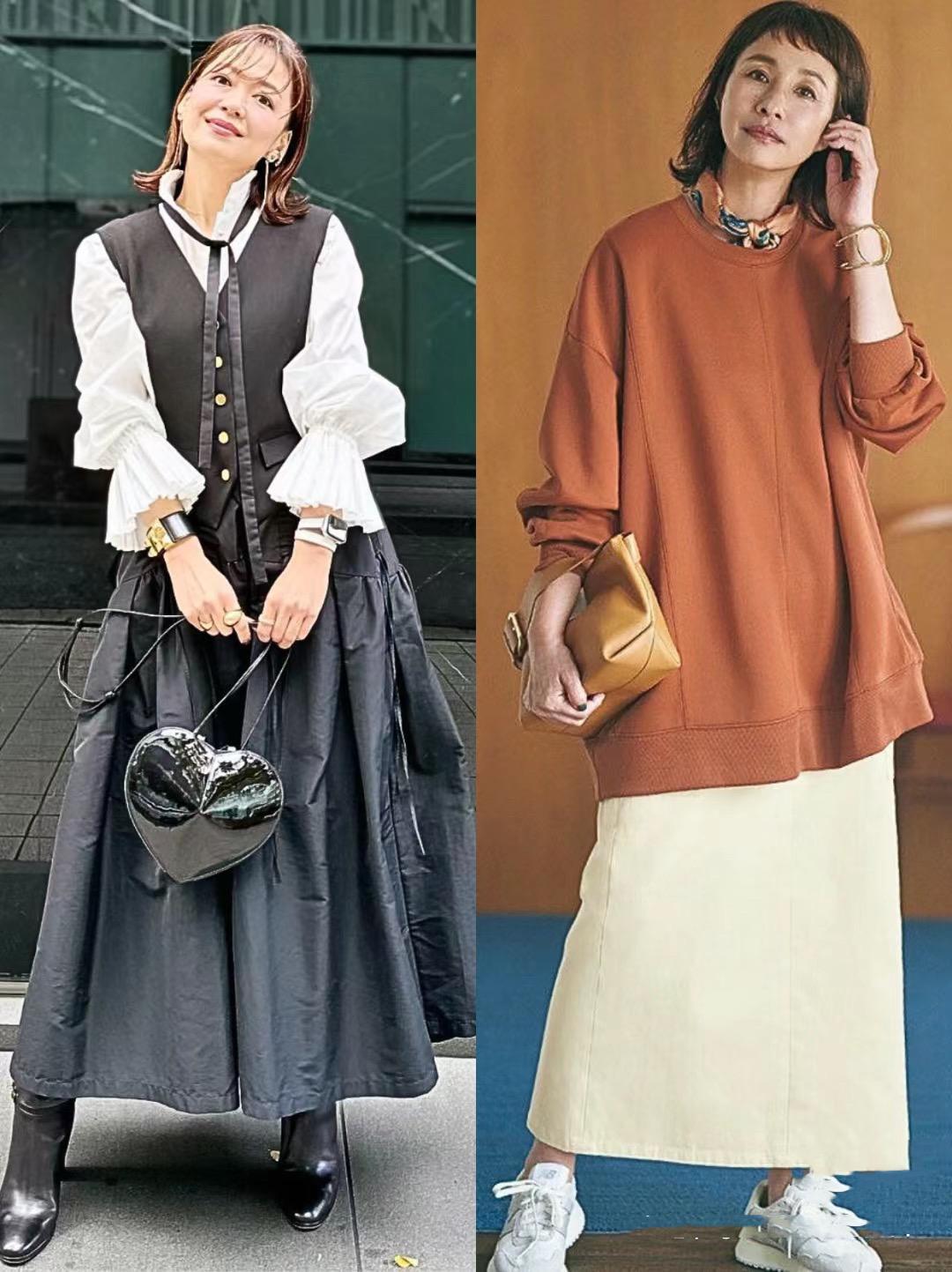 比如個性一點的木耳邊白襯衫,運用了宮廷風的衣袖,搭配修身的馬甲、半身裙,就更加貴氣減齡。日雜風中,這樣的穿搭方式、就可以更好的弱化年齡感。