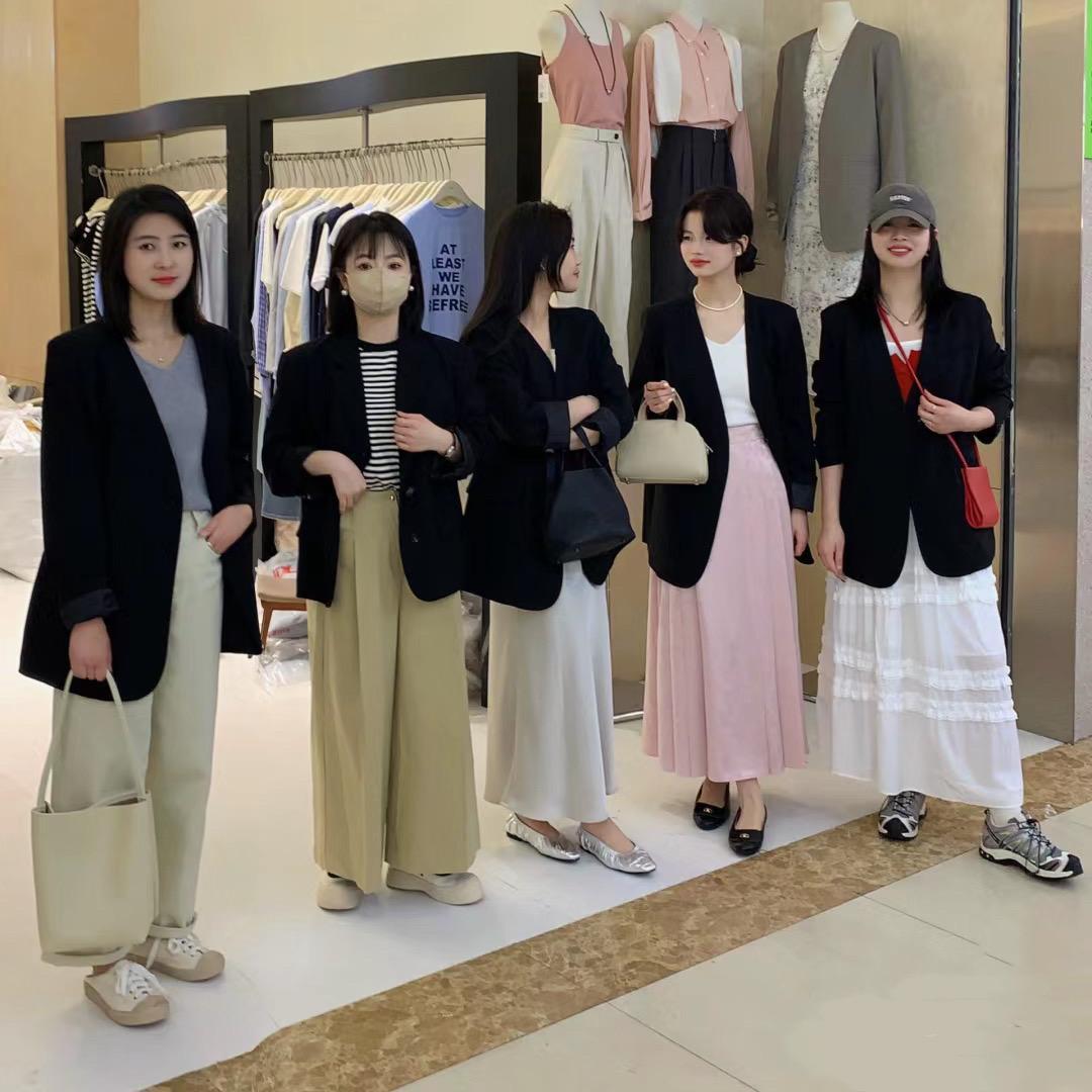 經典的黑色西服外套,利用了小廓形的剪裁,可以給人一種舒適大氣的姿態。寬鬆的黑色西服,配上修身的針織衫或者打底衫,都很內斂。搭配半身裙更溫柔,配闊腿褲更提氣質。