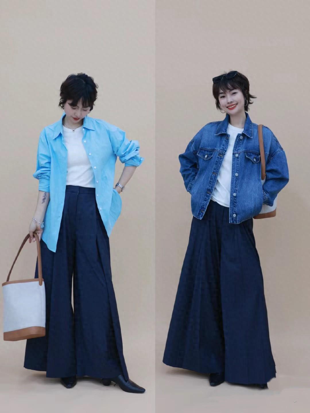 比如我們穿一件淺藍色襯衫,搭配黑白條紋打底衫,就非常的高級醒目。藍色襯衫不僅提升了整體亮度,在靠近面部肌膚的位置、顯白效果也是非常棒的。