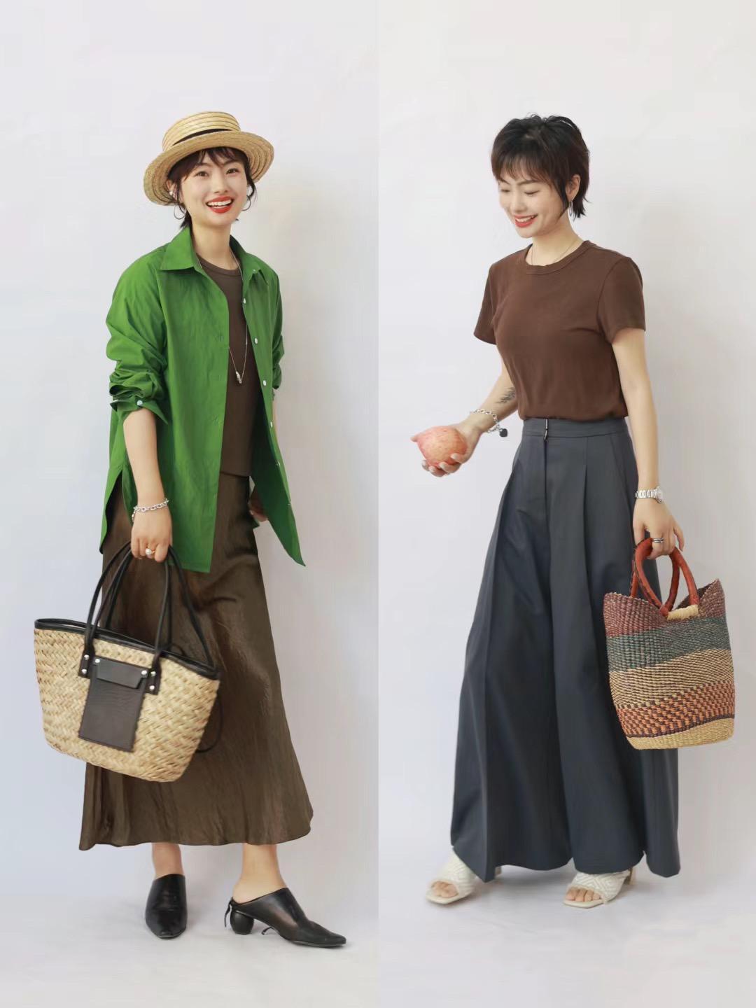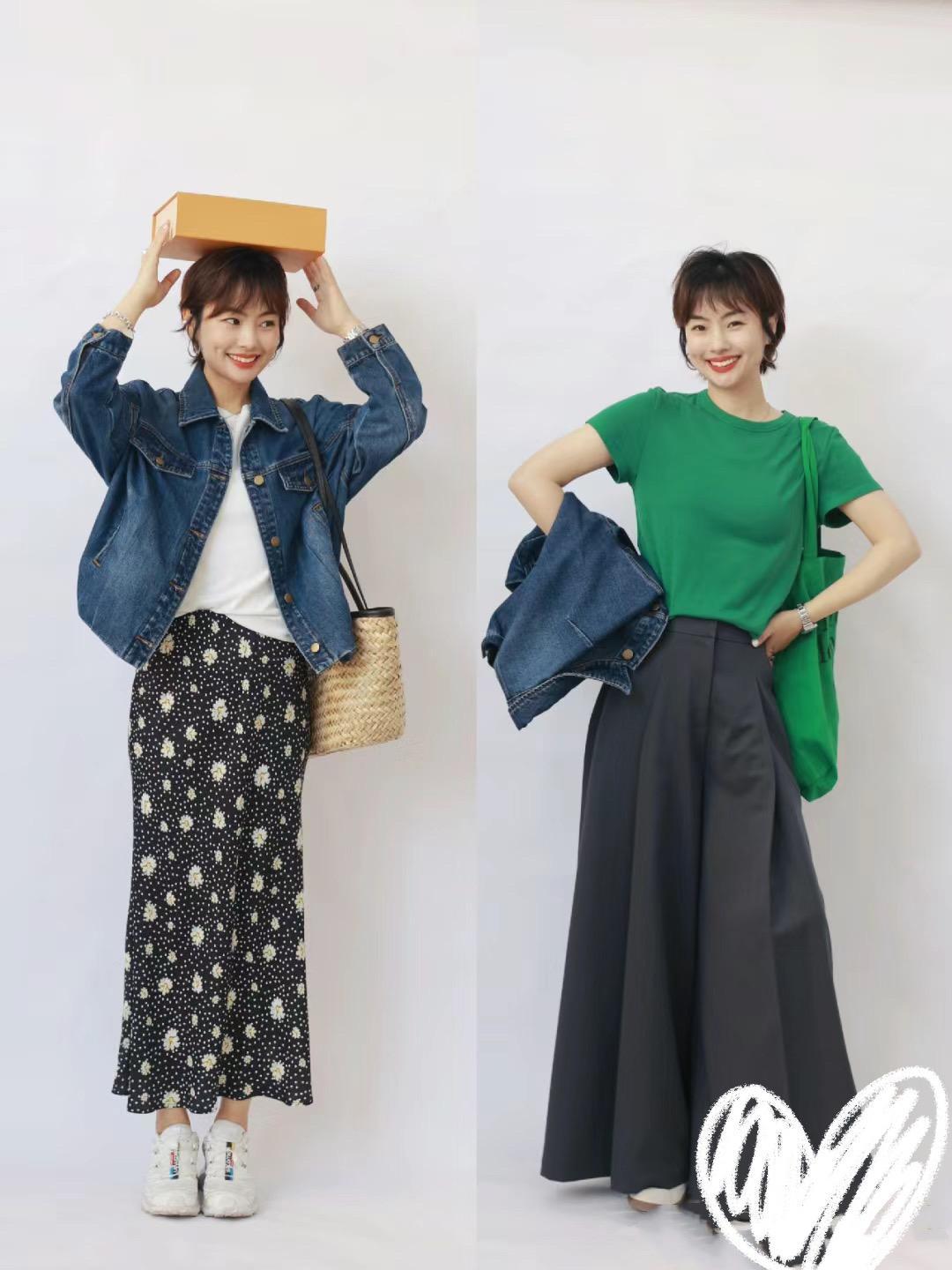 穿修身一點的T恤,可以搭配高腰的闊腿褲、或者半身裙。想要比例感更加完美,我們只需要將T恤的下襬塞進褲腰/裙腰裏,抬高腰線又拉伸腿長,非常的顯氣質。