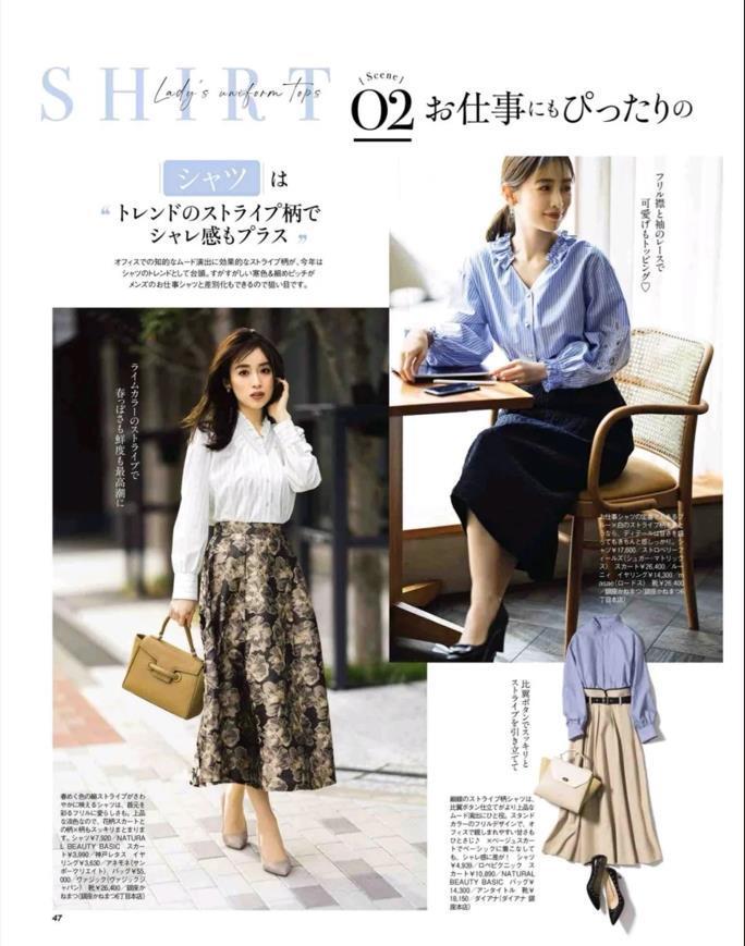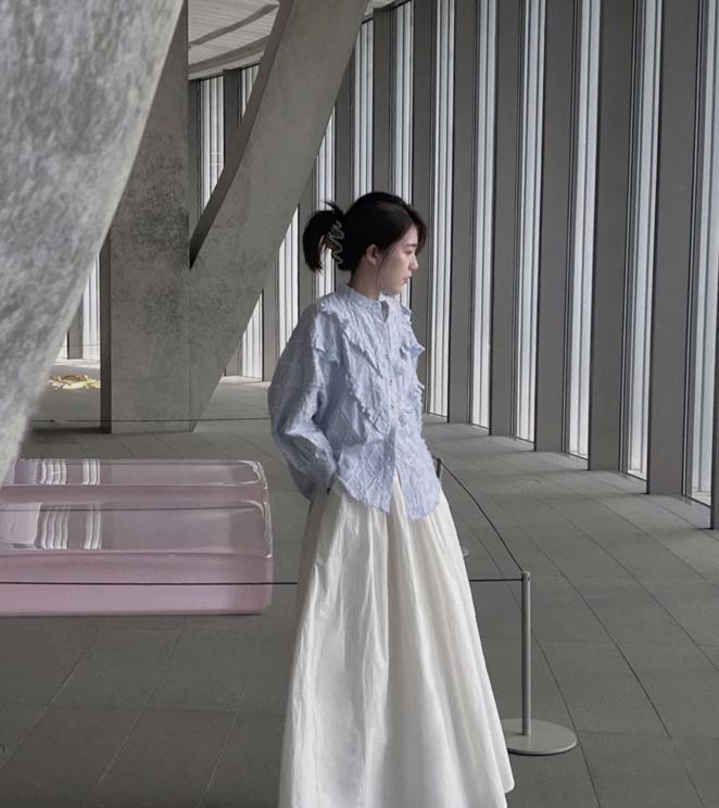 反之,如果襯衫是條紋、碎花的,那麼迷笛裙就建議選純色,這樣纔可以很好平衡整體的造型,避免過於繁瑣複雜。