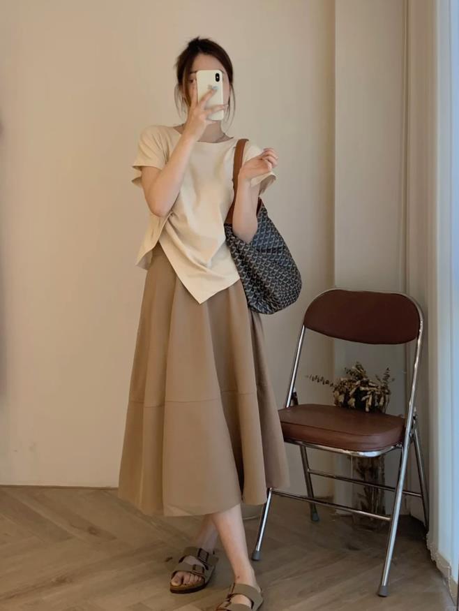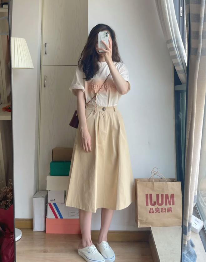 實在是太愛這種簡單又不失日常的搭配了,完全不挑人的,也沒有年齡的限制,迷笛裙的版型超級遮肉顯瘦,下身胖的姐妹一定要試試。搭配一件t恤簡單又好看。