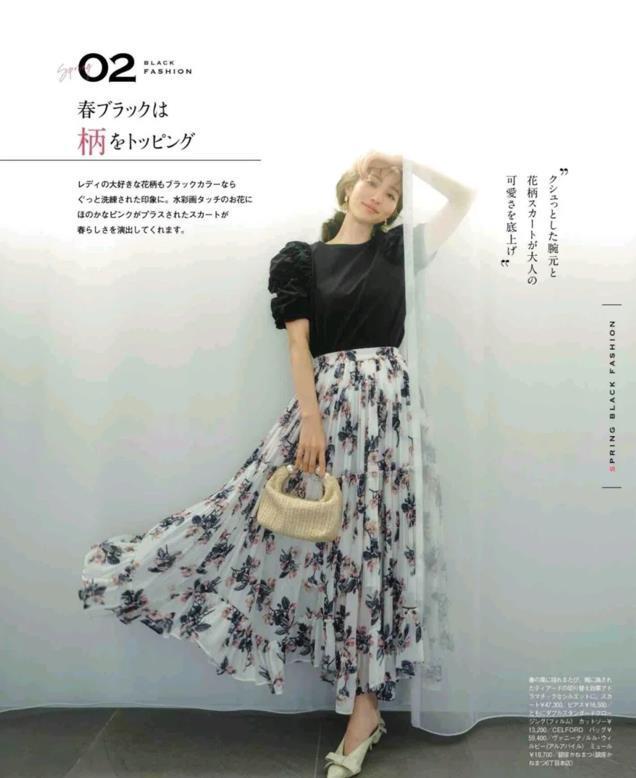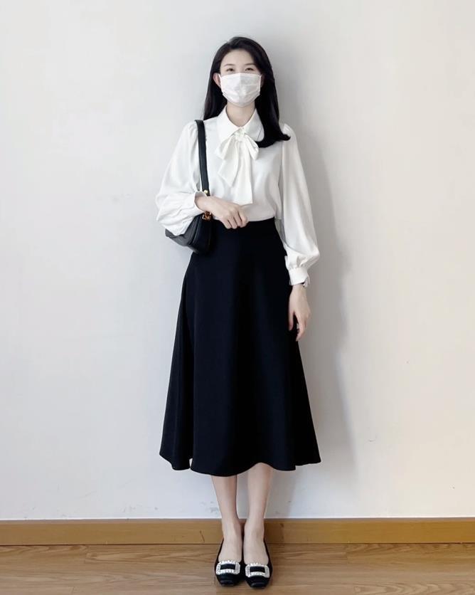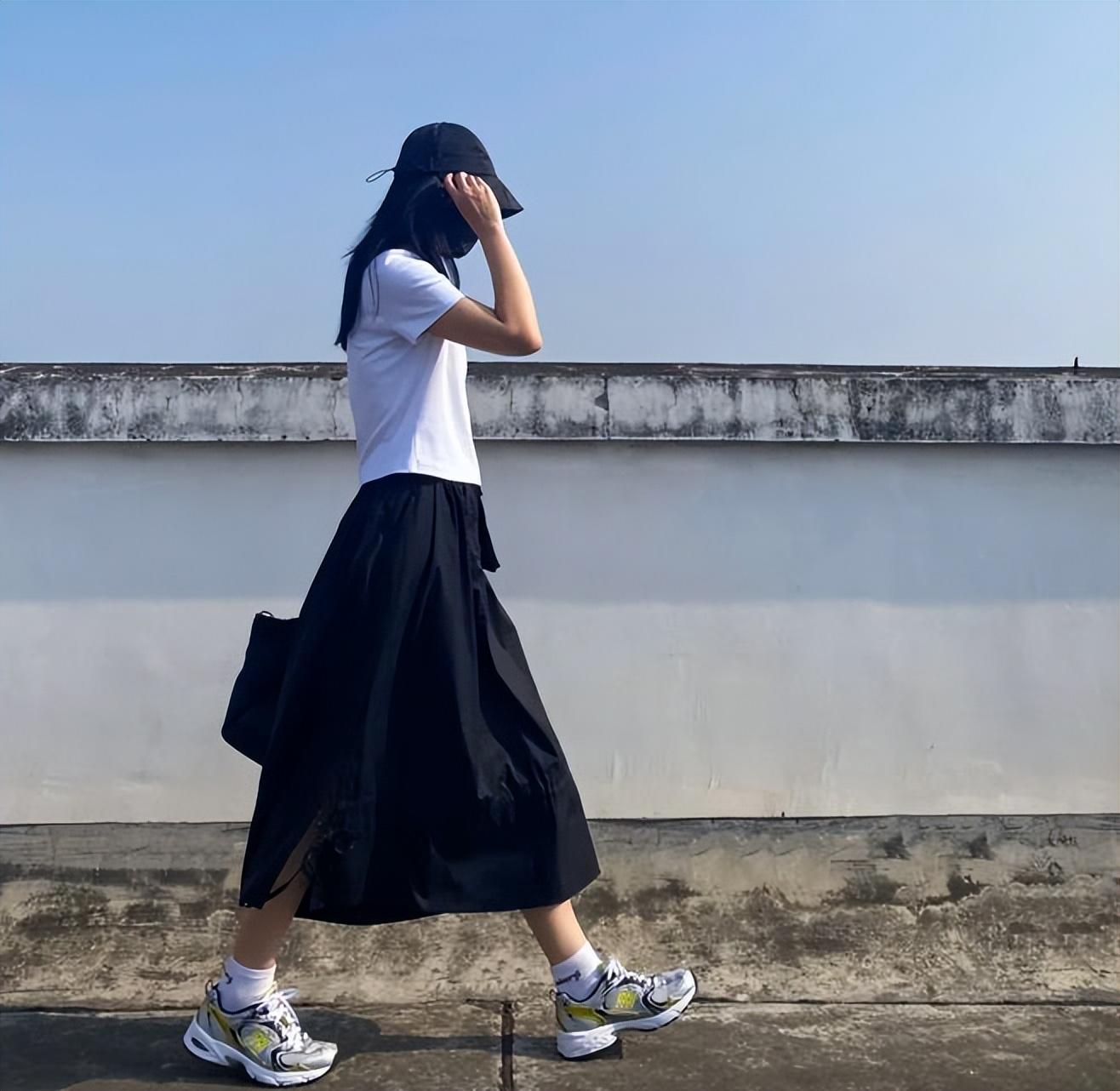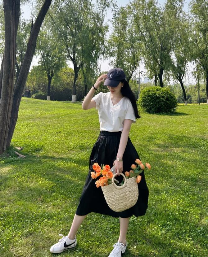 這一套看起來也太溫柔了,對吧?經典的黑白配色,無論如何都是不會出錯的啦,簡單的白色短袖t恤+黑色迷笛裙,一整套看起來就很不挑人。比較適合懶人姐妹們,偏韓系風格的組合,出門踩着一雙運動鞋、再佩戴一頂棒球帽,青春又充滿活力。