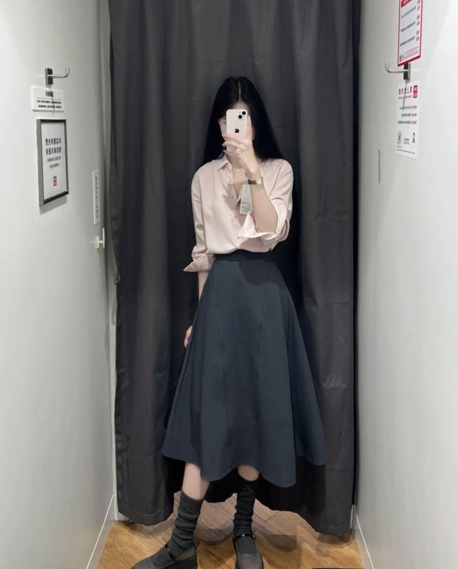 當你選擇了一條迷笛裙,卻不知道與什麼上衣來配的話,那麼就試着搭配一件襯衫吧,真的非常顯氣質和優雅。迷笛裙流暢的線條感,和寬鬆的版型剪裁,使得它成爲了衆多女性衣櫥的最佳選擇,襯衫的簡潔大方與迷笛裙正好互補。