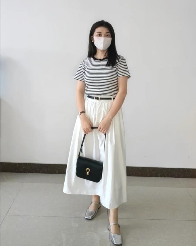條紋t恤+白色迷笛裙,看起來很單調的裙子,結合起一件條紋t恤後,就變得簡約又不簡單了,很適合通勤的時候穿。