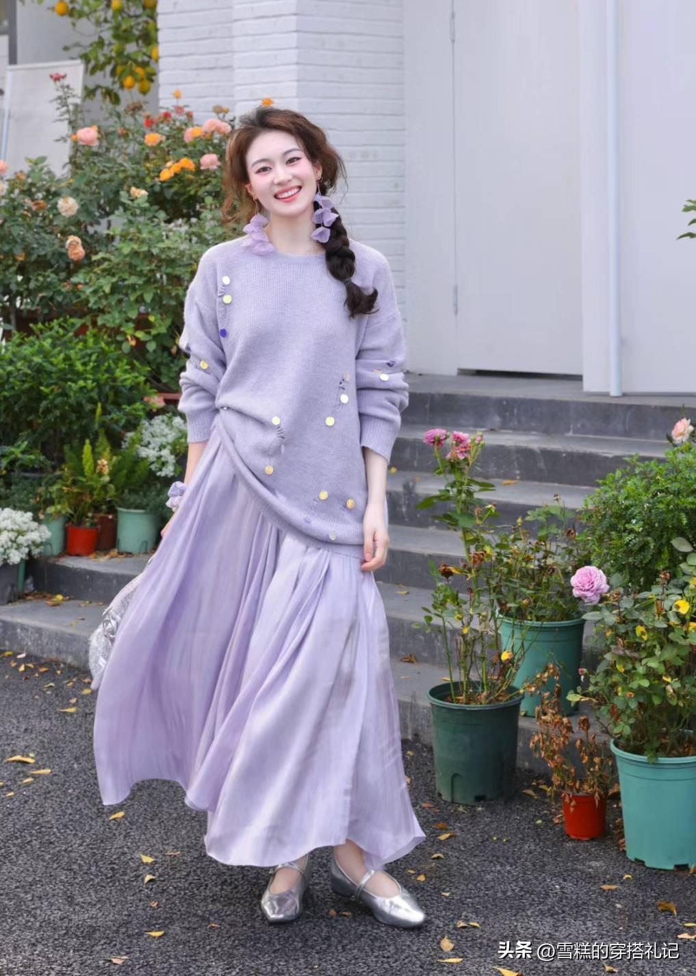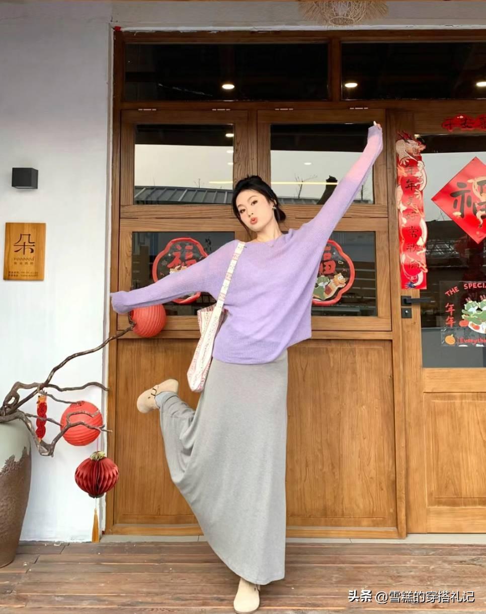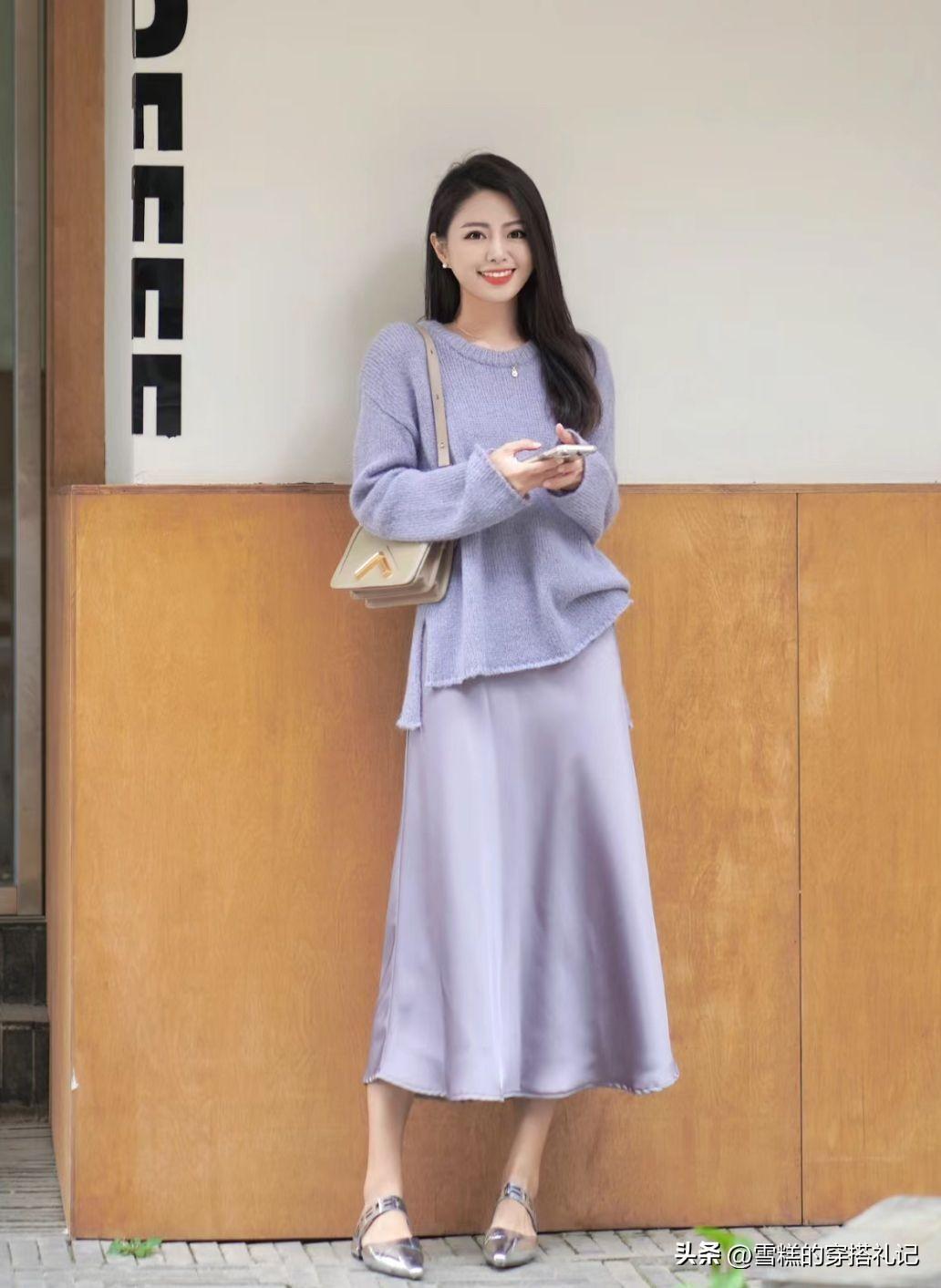 比如,紫色的寬鬆款針織套衫,就不要搭配色彩太鮮豔的下裝了,換成顏色簡潔基礎的灰色半裙,盡顯中年風韻。
