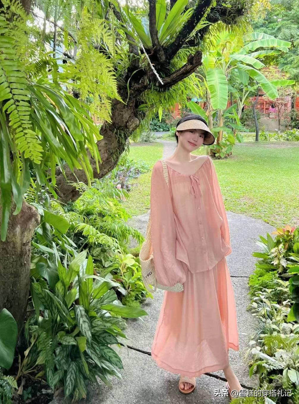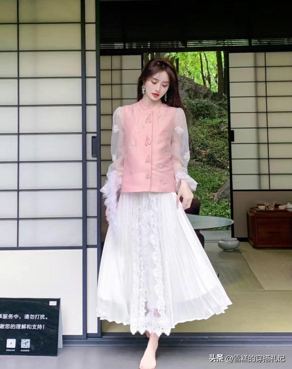 像這一件桃色的新中式馬甲,疊穿透視面料的襯衫,不僅特別時尚,還頗有一絲古典高雅的氣息。下裝則可以搭配一條百褶款式的白色半身裙,恰好和襯衫形成色彩上的呼應,又能夠讓整體風格更柔美。