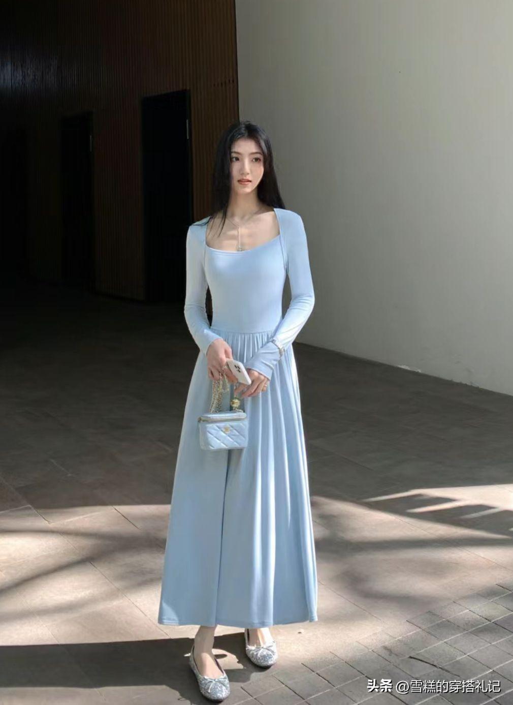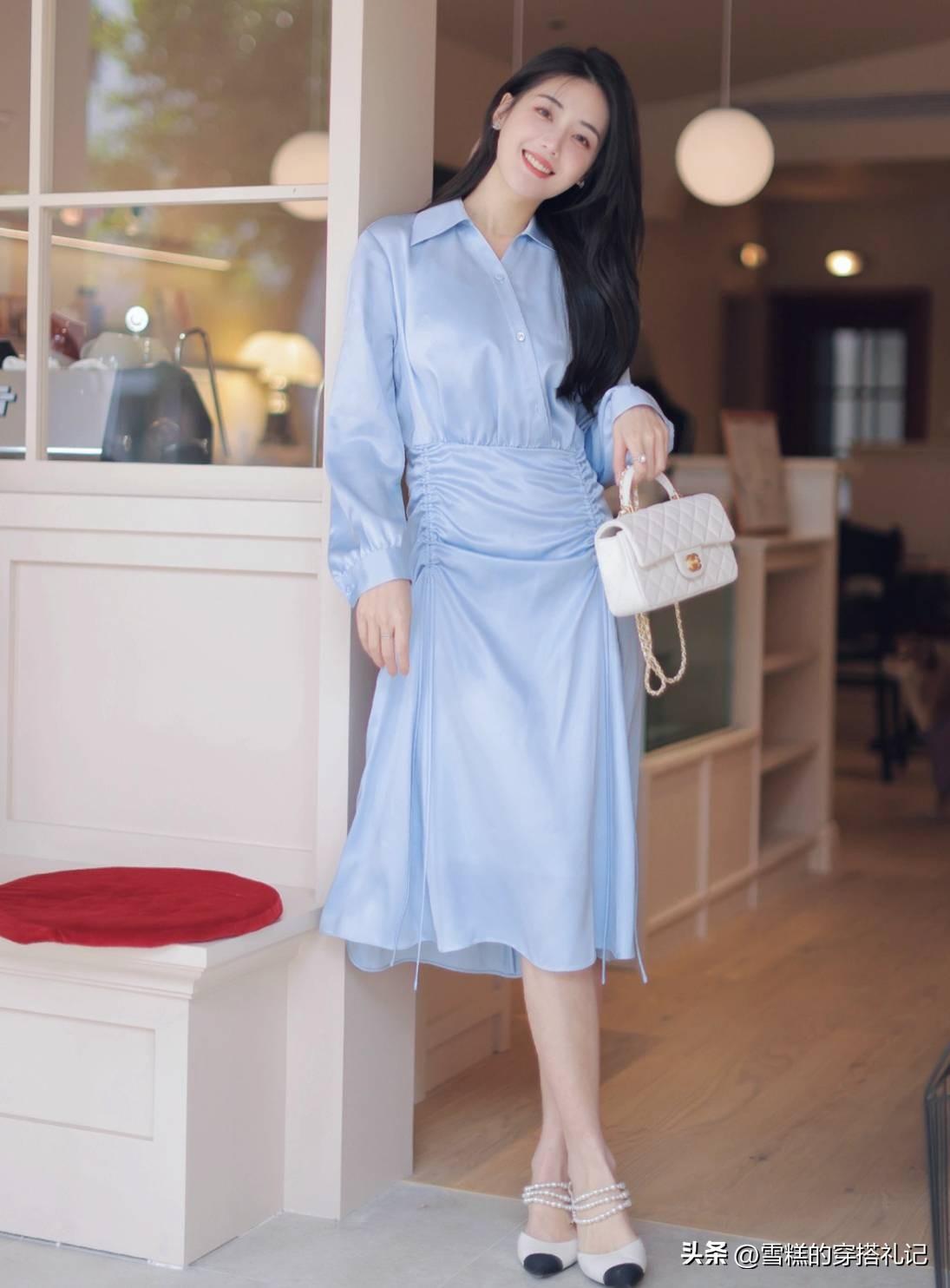 將冰川藍大面積覆蓋於主導單品當中,可以瞬間讓人眼前一亮,這種淺淡的藍色調,不管是黃黑皮還是冷白皮,都能輕鬆穿出高級感,而且還很有春日的氛圍;再將白色點綴配飾和包包上,又能達到很好的過渡效果。