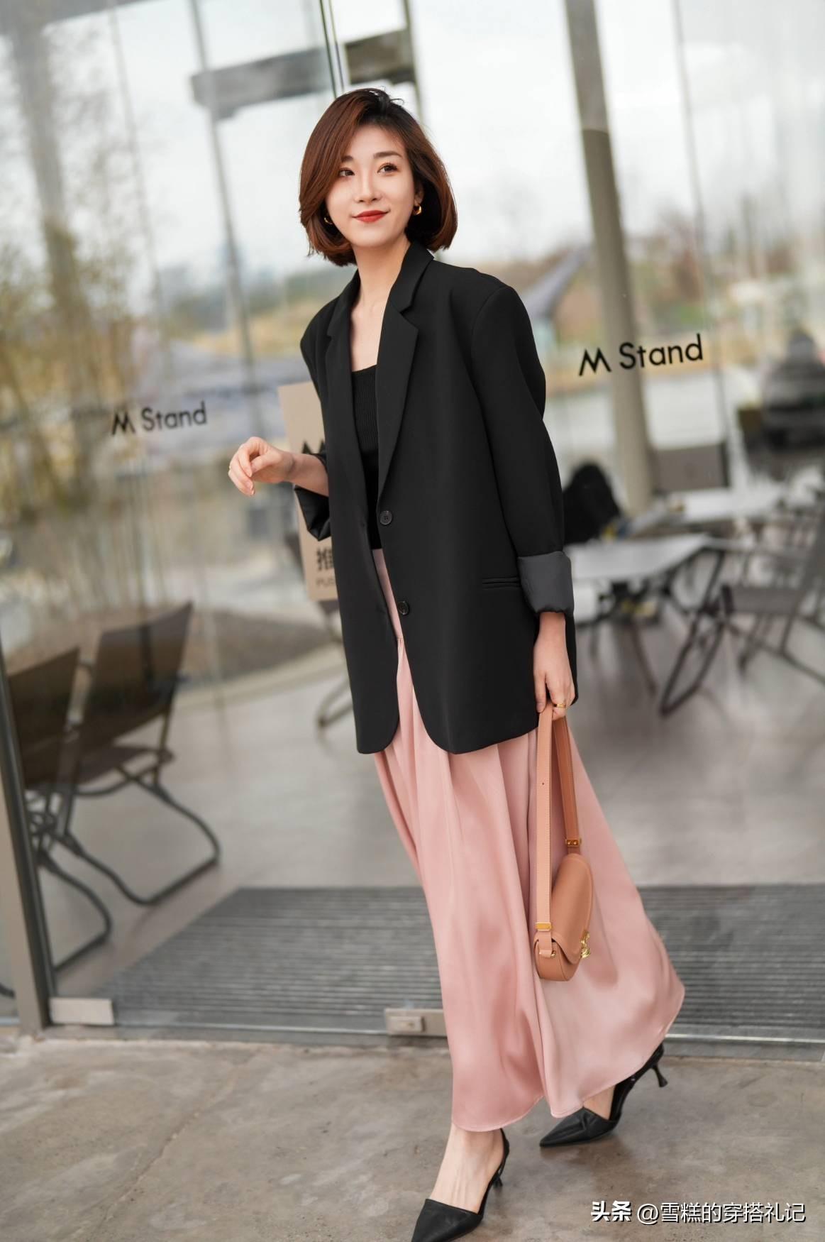 比如,柔和桃的絲綢半身裙,就可以和西裝組合出又美又颯的效果,無論是日常生活還是通勤上班,適配度都是特別高的。