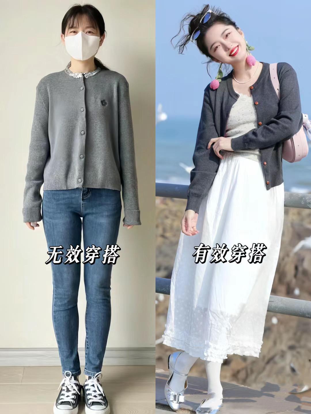 比如灰色針織衫配修身的牛仔褲,也把腿型暴露無遺,視覺上不夠美觀。沒有筆直修長的雙腿,還是建議選擇寬鬆的裙裝來搭配,包容性更強、也更加浪漫溫柔。