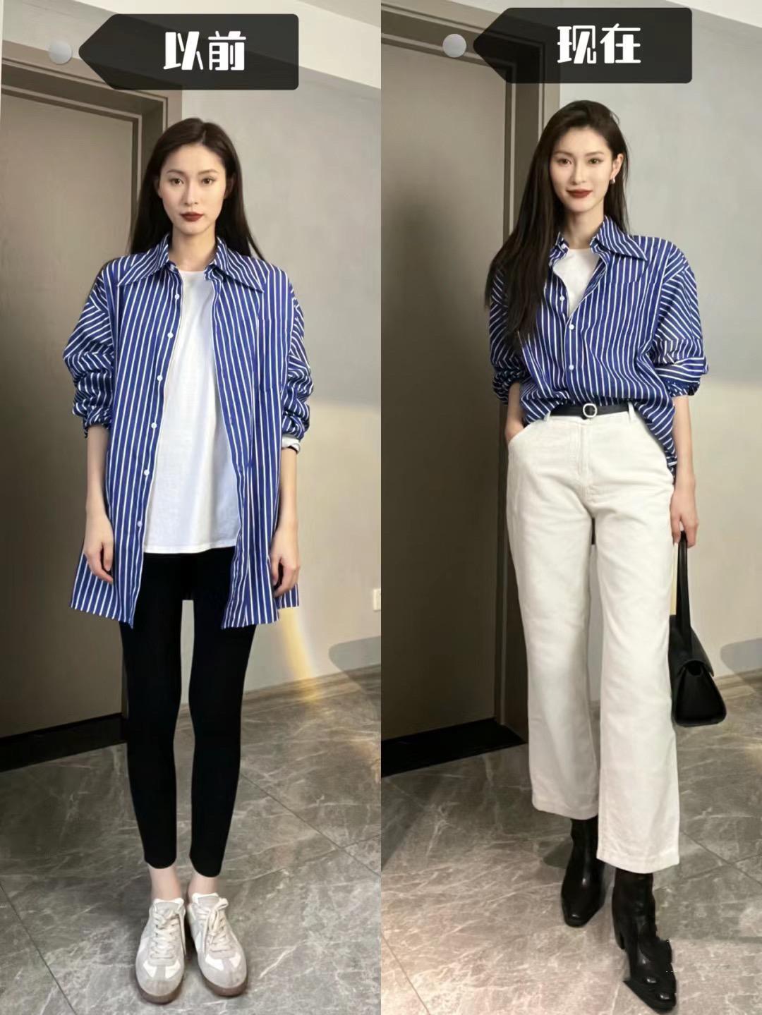 以前的你遇到現在的你,同一件衣服也會穿出不一樣的效果。比如經典的條紋襯衫,我們依然可以疊搭白色T恤,但穿衣方式變化一下就更洋氣。