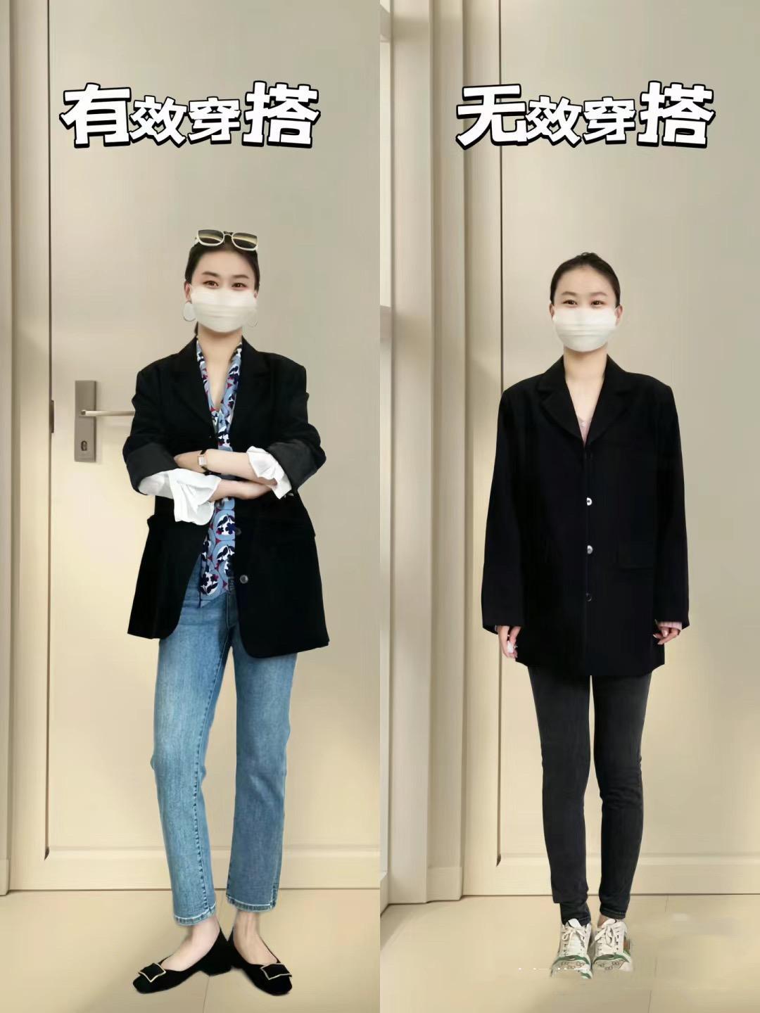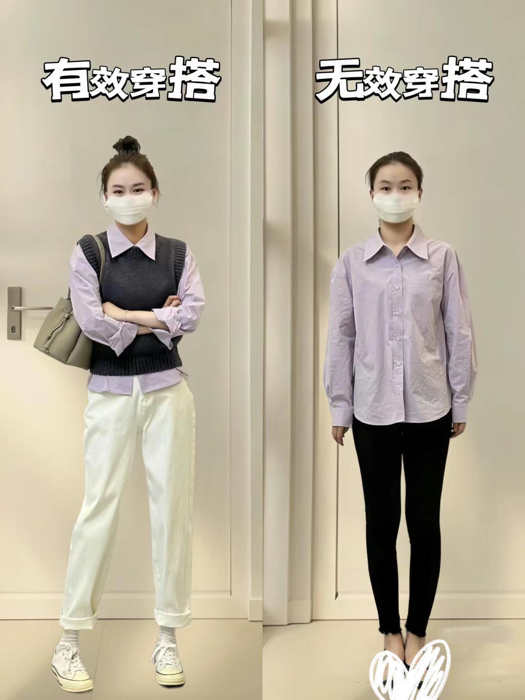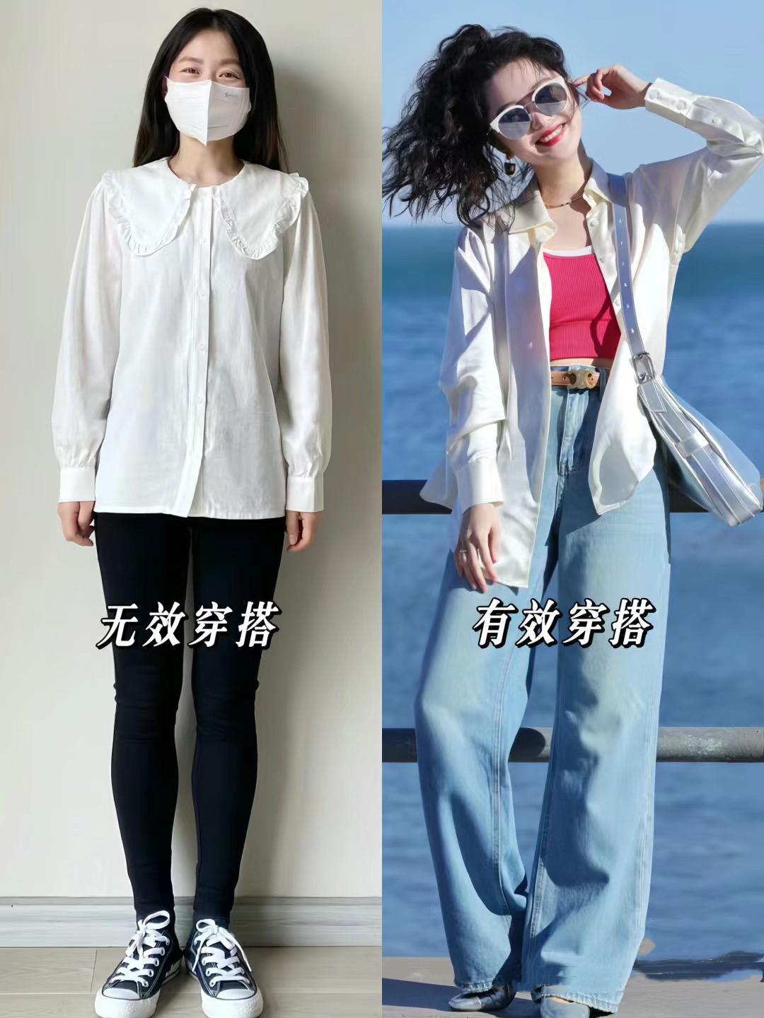 所謂無效穿搭,就是對於美的表現性不強。只注重服裝本身的穿着,搭配之間也沒有多餘的關鍵。就像白襯衫配小黑褲,穿起來就顯得下肢厚重。而有效穿搭,白襯衫配玫紅色吊帶大直筒牛仔褲,就更加時髦洋氣顯腿長。