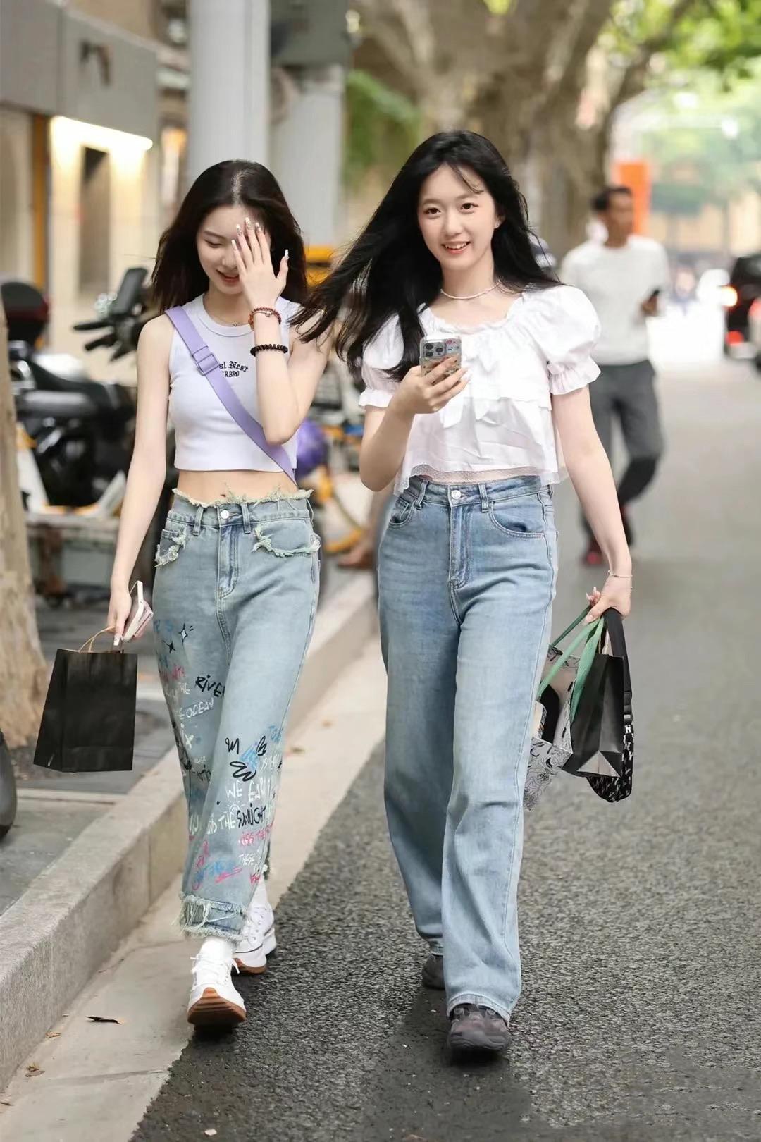 修身的白色小背心,配上高腰的牛仔闊腿褲,上短下長的組合,對於小個子也很友好。牛仔闊腿褲儘量搭配淺色系,穿起來更符合春夏氛圍。